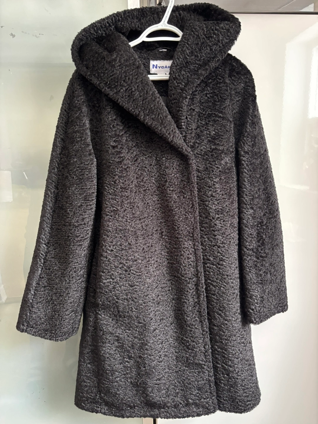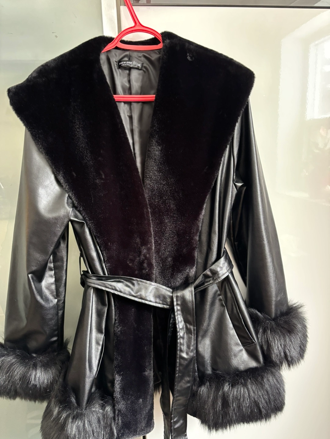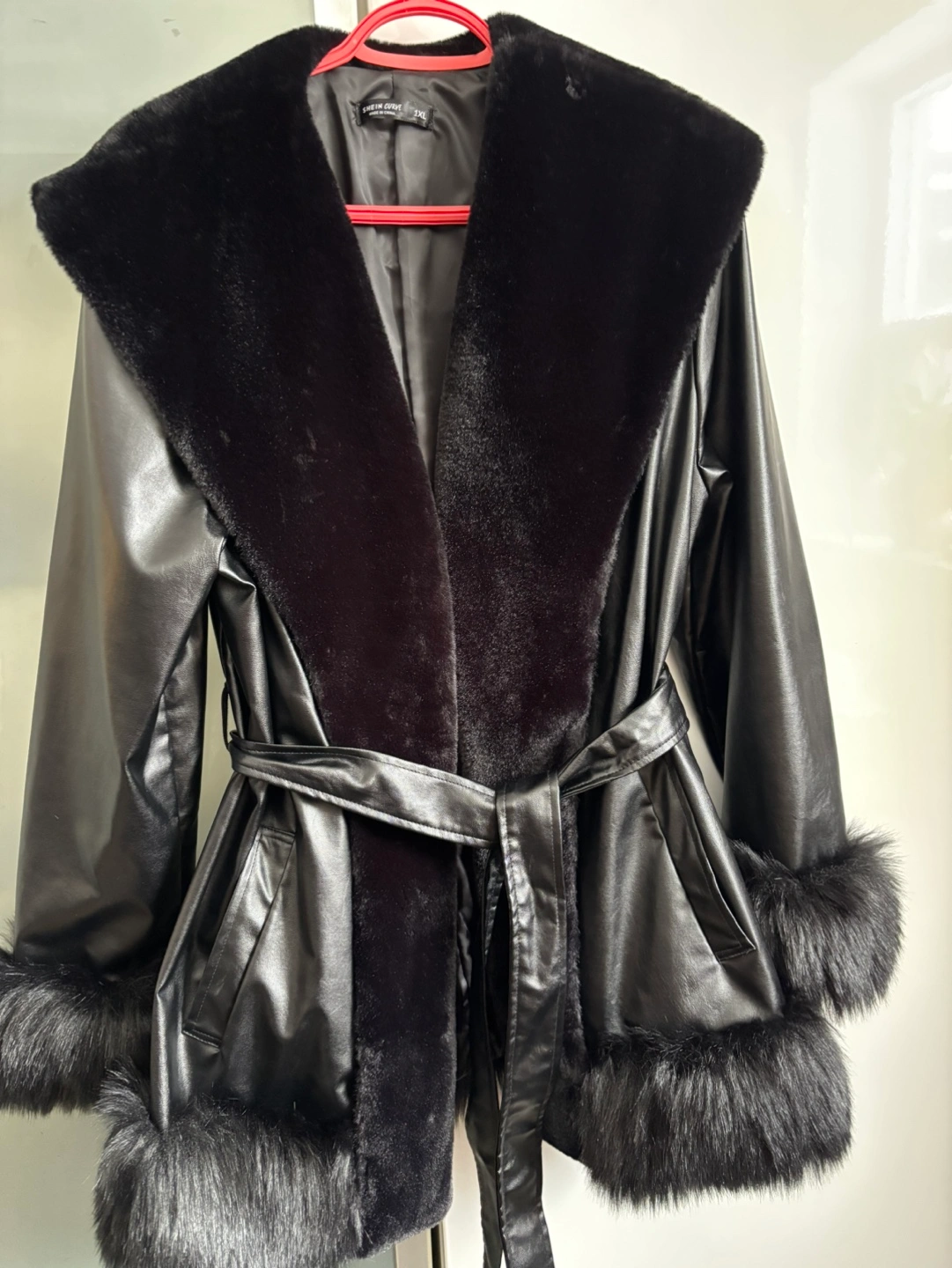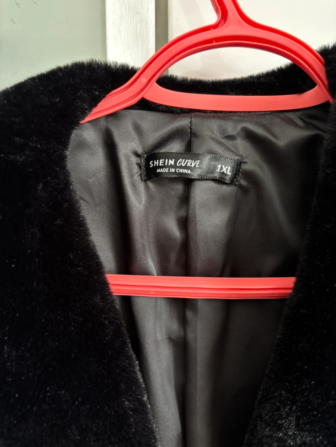 Two black coats for sale. One is a hooded, long, fuzzy black coat by Nygård, size medium. The other is a black faux leather and fur coat by SHEIN CURVE, size 1XL. Both are gently used and in good condition. $60 for both