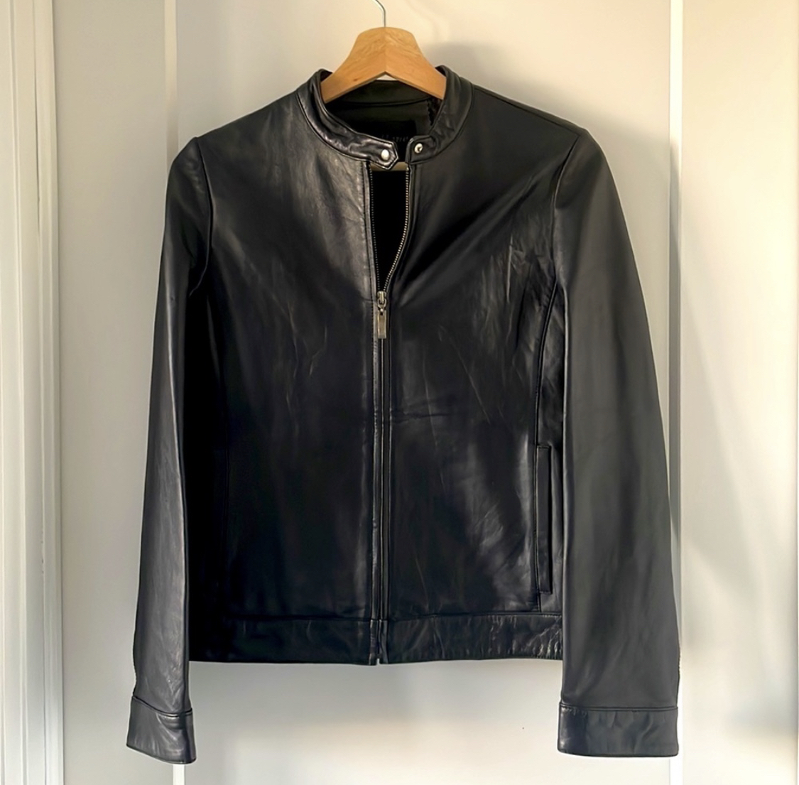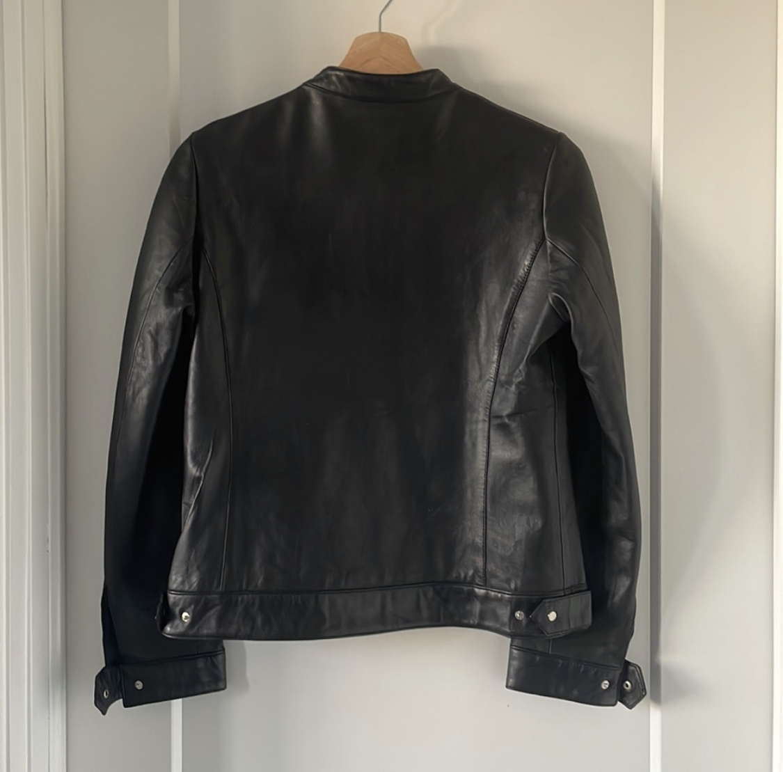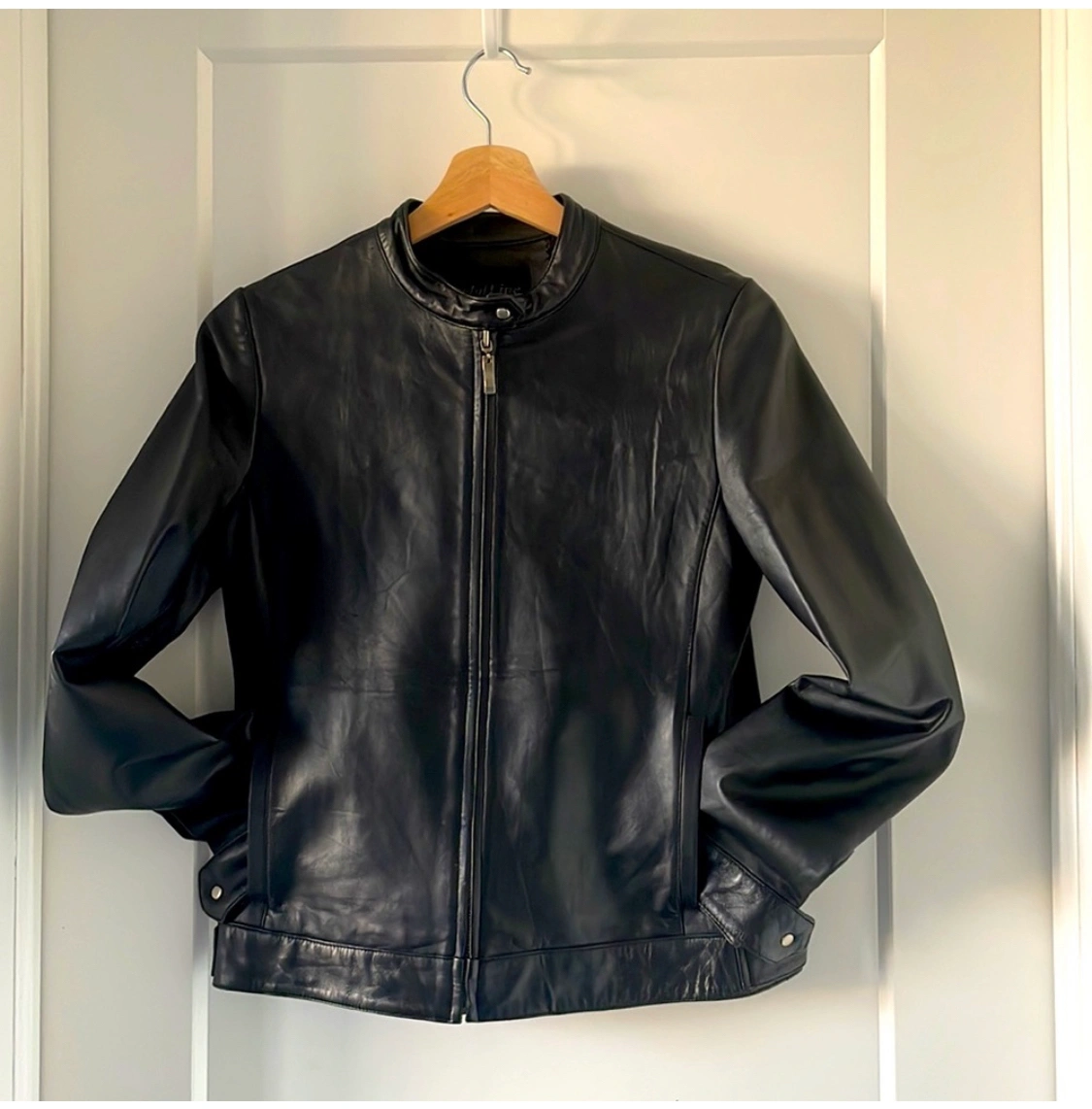 66Women’s small zipper leather jacket with mandarin style collar and snaps at cuffs. Can be made narrower at waist with snaps.