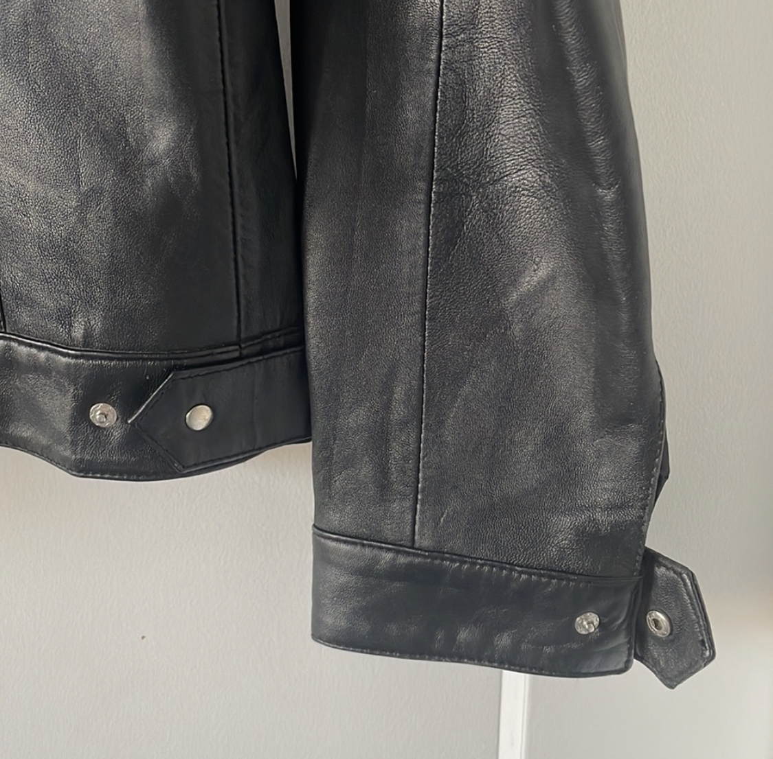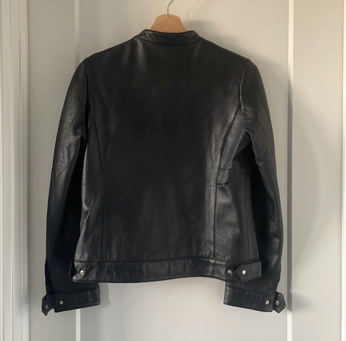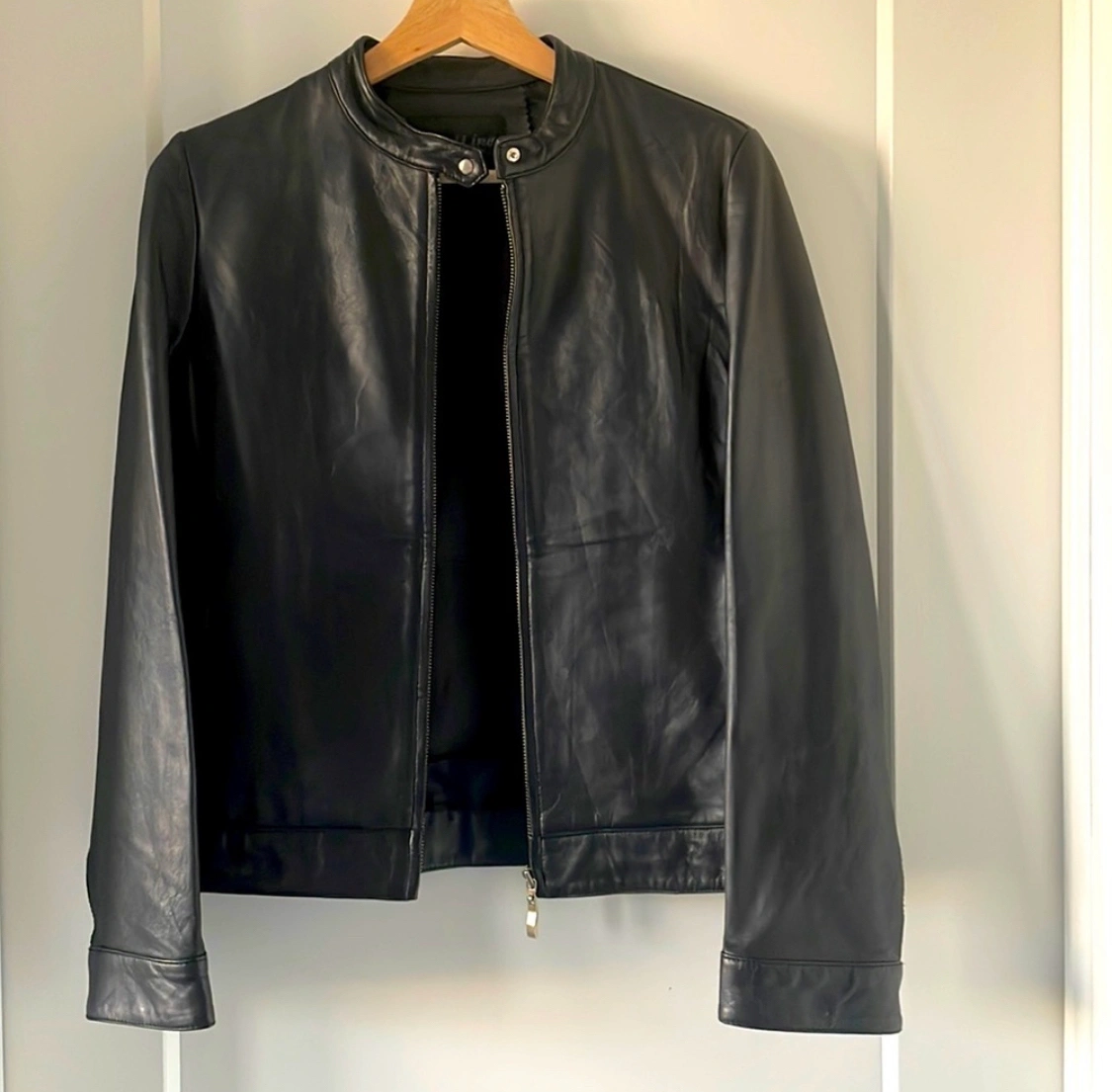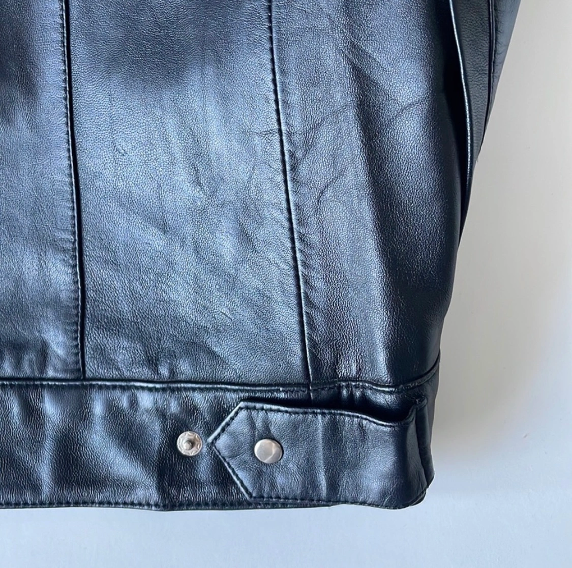 66Women’s small zipper leather jacket with mandarin style collar and snaps at cuffs. Can be made narrower at waist with snaps.
