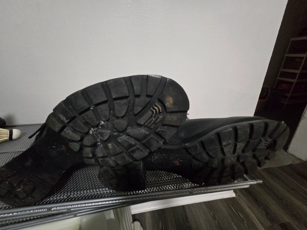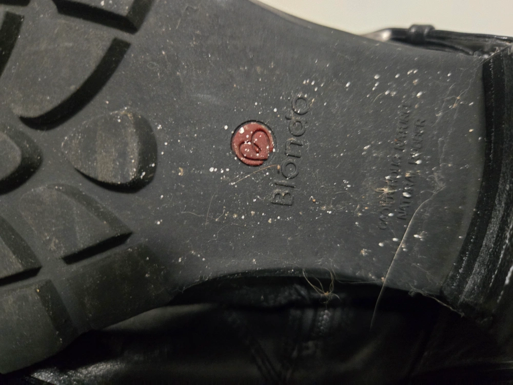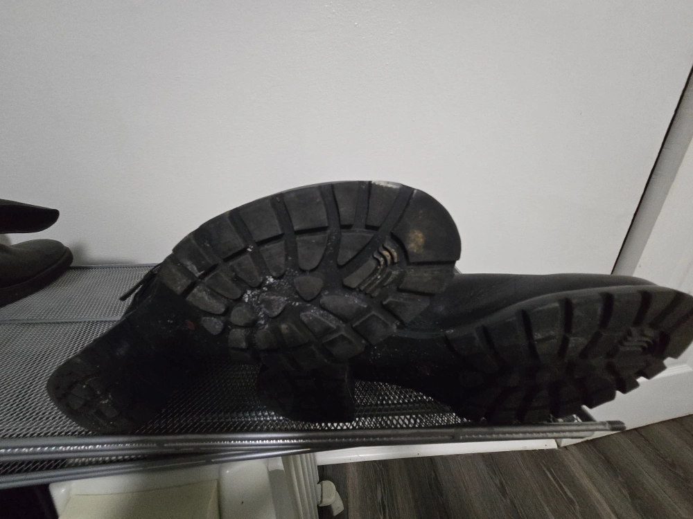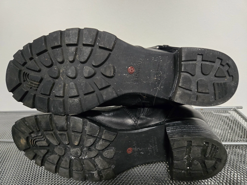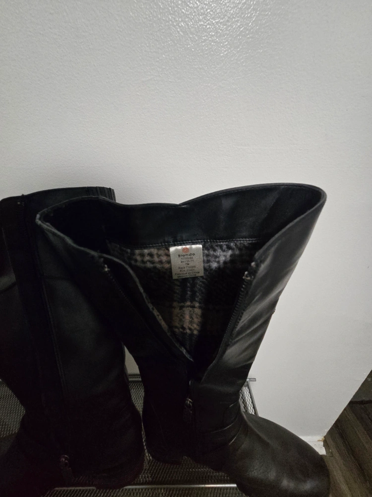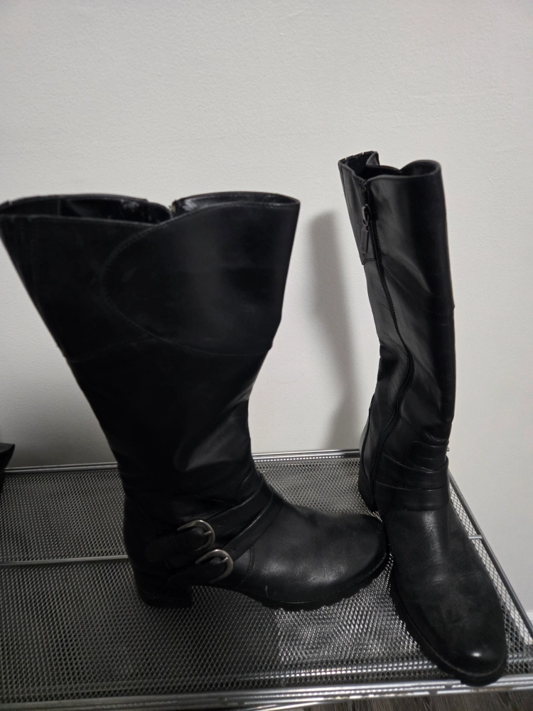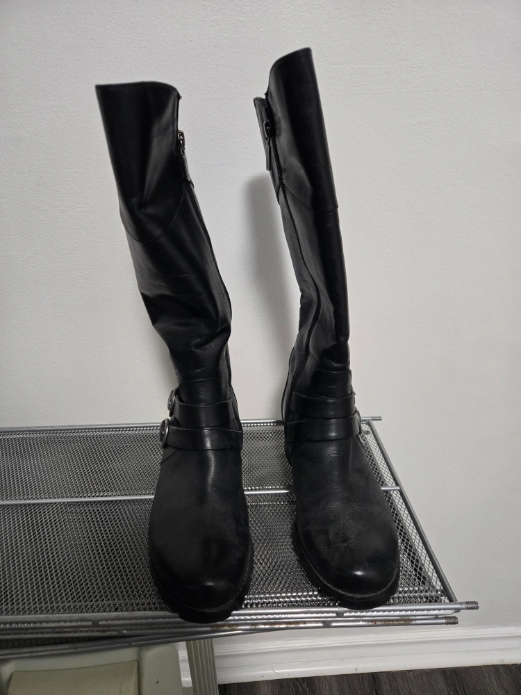 437Pair of black leather long boots. Features side zippers and buckles. Good for fall and winter.