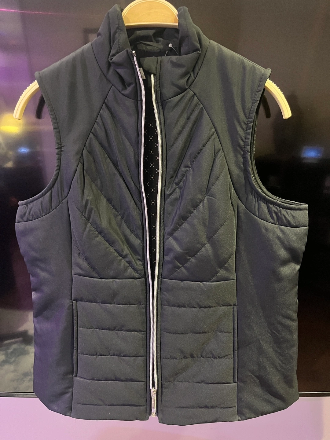 Black quilted vest. Zip-up front. Sleeveless. Medium size. Polyester. Machine washable.