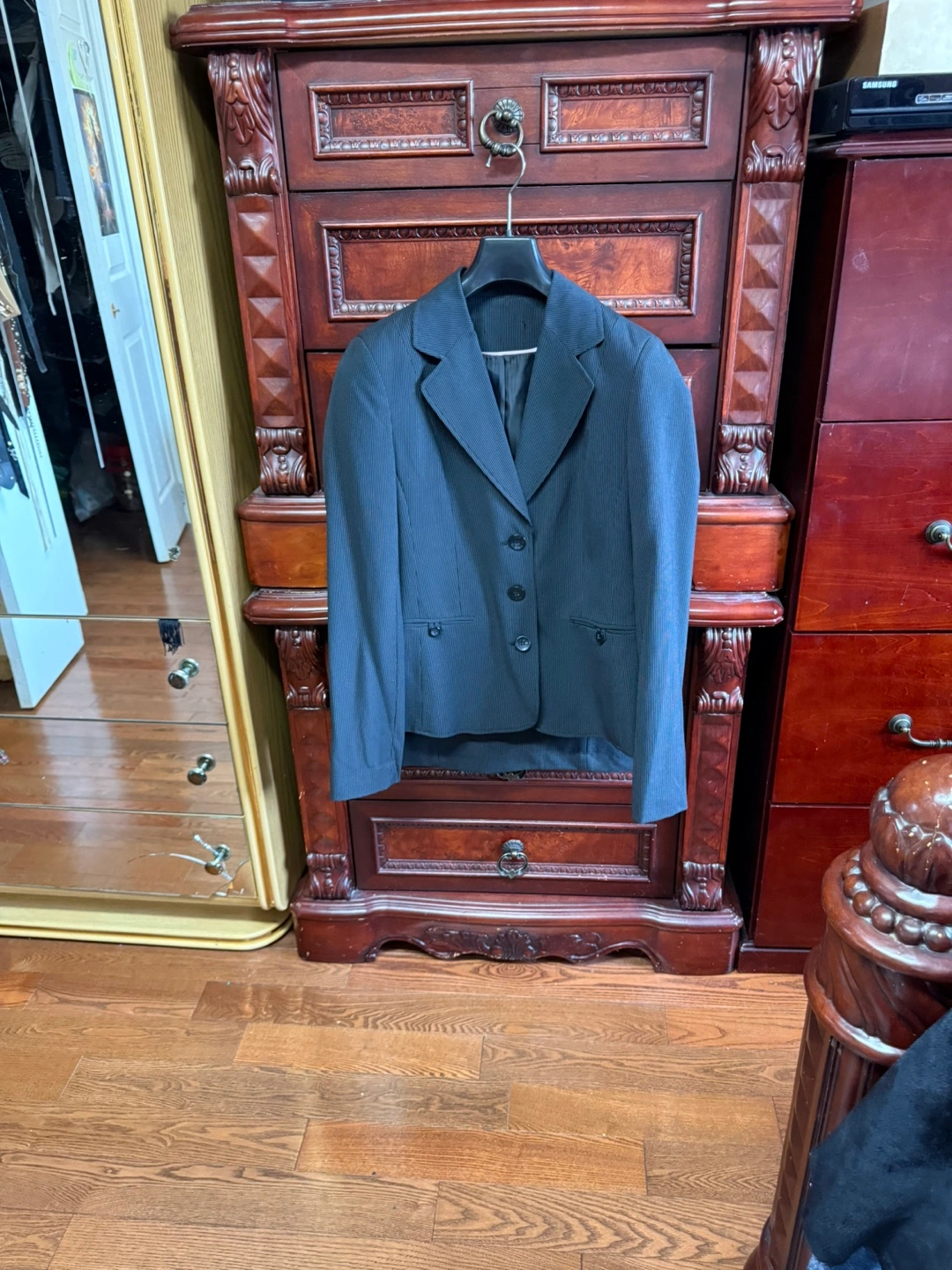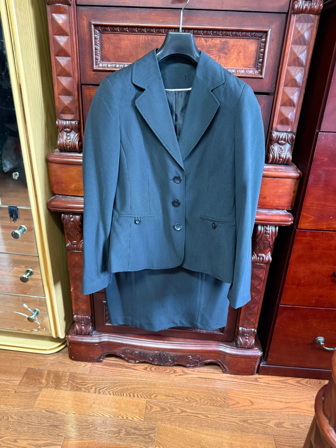 32Professional women's suit. Dark grey pinstripe fabric. Jacket features three buttons. Matching pencil skirt. Great for work or special occasions.