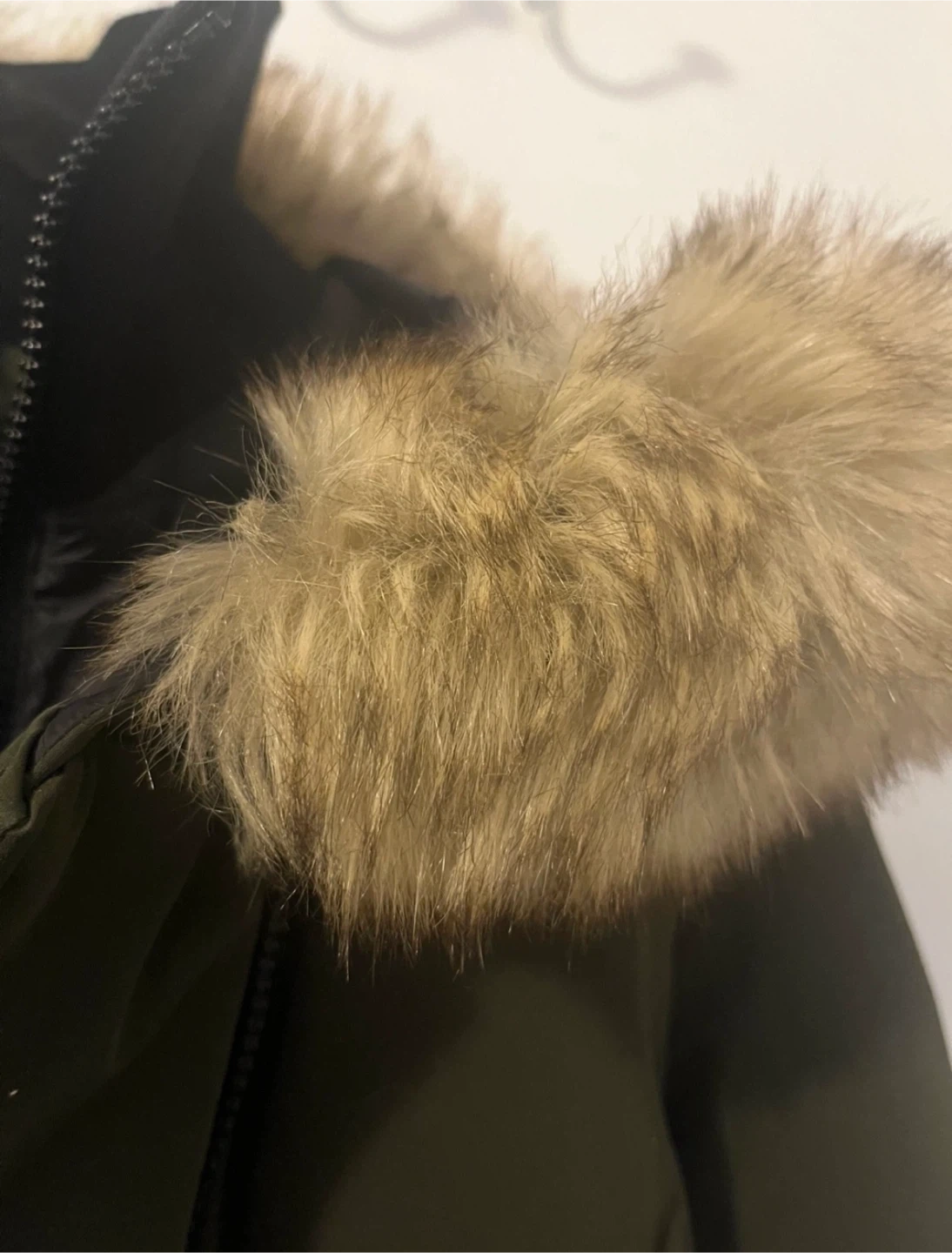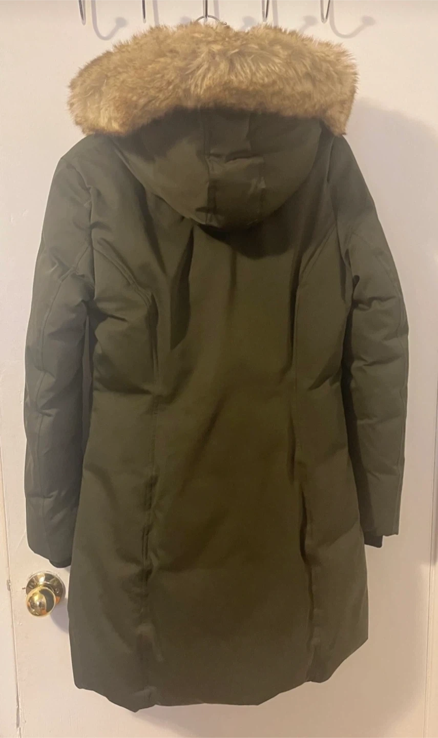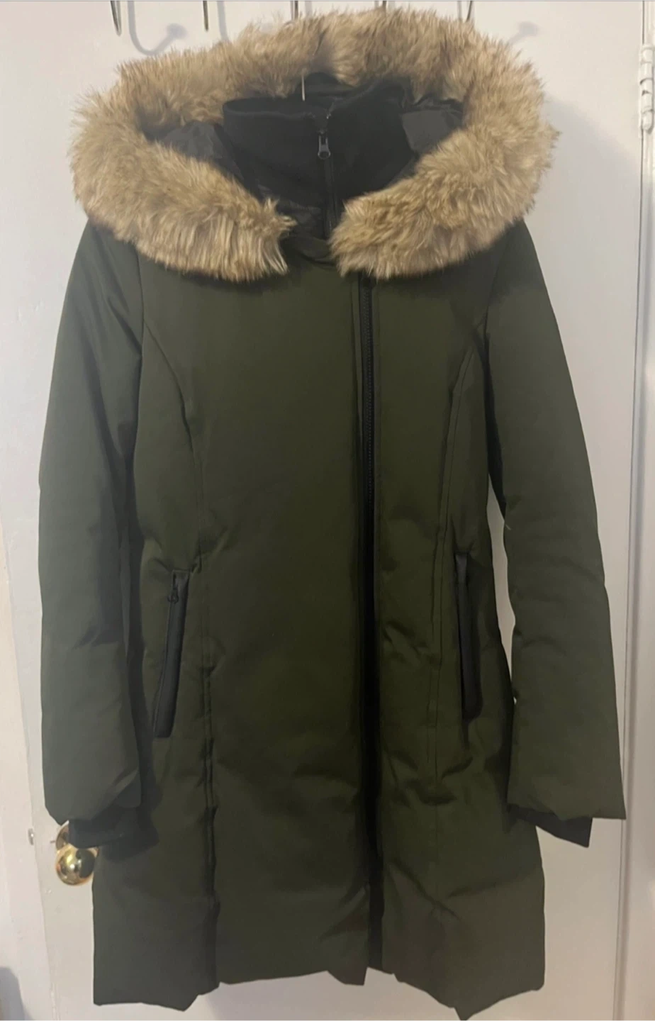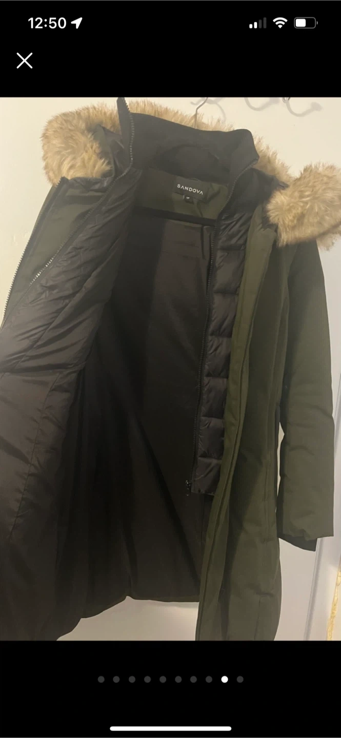 148Prepare ahead for winter with this Sandova winter coat filled with 80% duck down / 20% feathers — super warm and flattering. Features a faux fur-trimmed hood (not removable), inner wrist cuffs, and high-neck lining for extra warmth. Stylish off-centre zipper design with a double zip front for wind protection. • Women ’s Size Small • Deep olive green color • Perfect condition — clean, barely worn • Faux fur trim on hood (not removable) • Inner wrist cuffs & high-neck lining • Double zipper front (no snaps) 🏡 From a pet-free, smoke-free, clean home 📍 Pickup Midtown Toronto