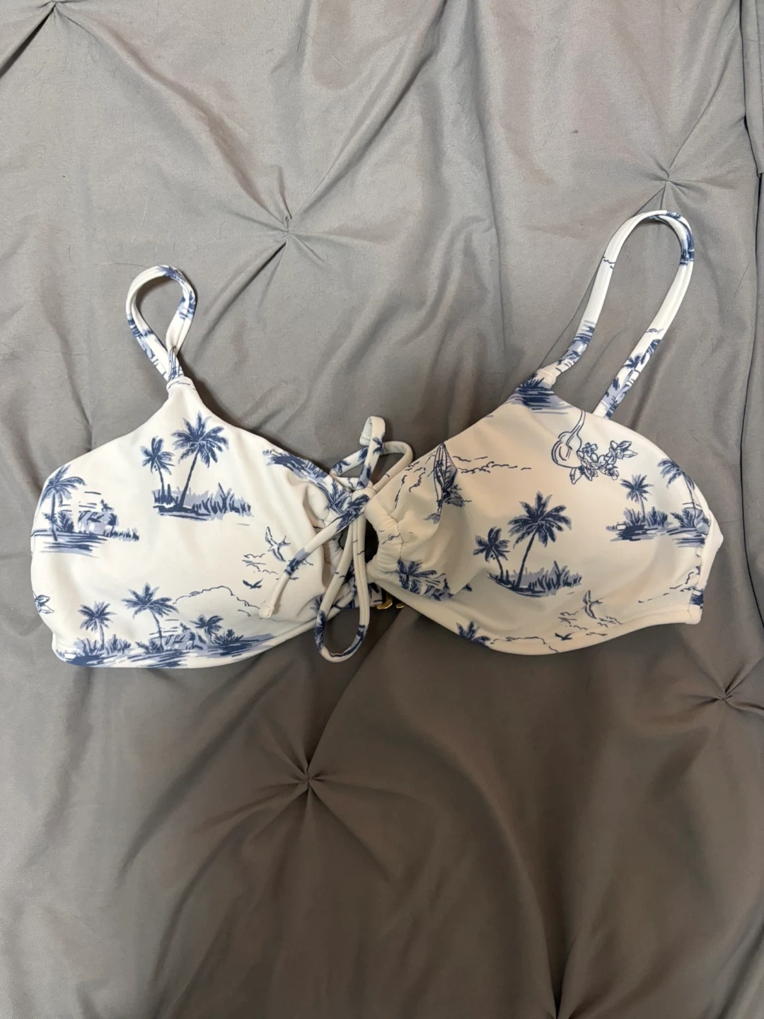 Cute bikini top with a fun palm tree and island design in white and blue Perfect for your next beach trip or pool day