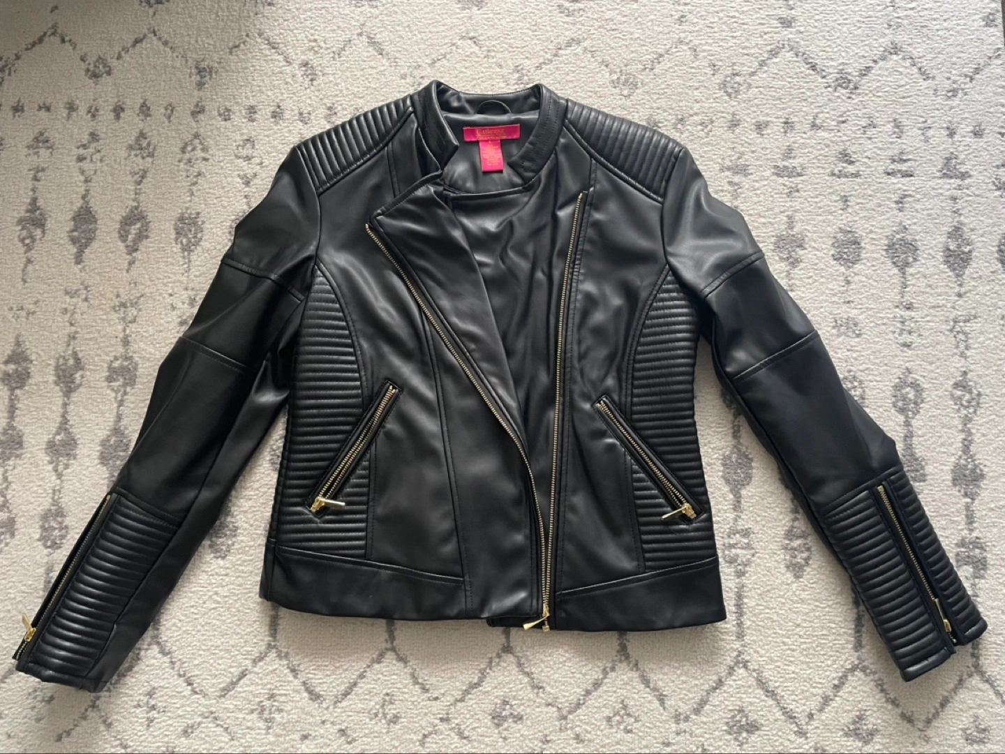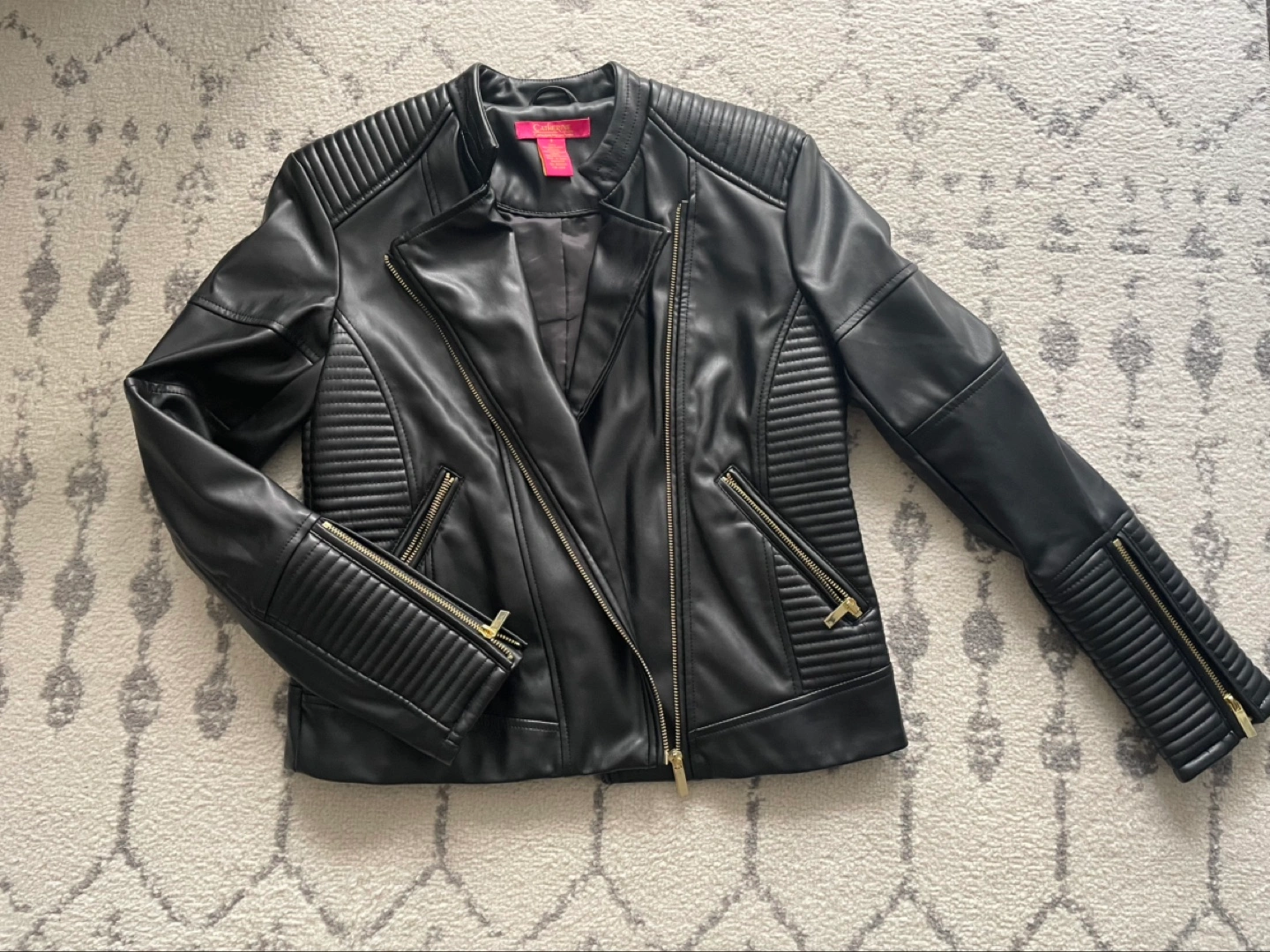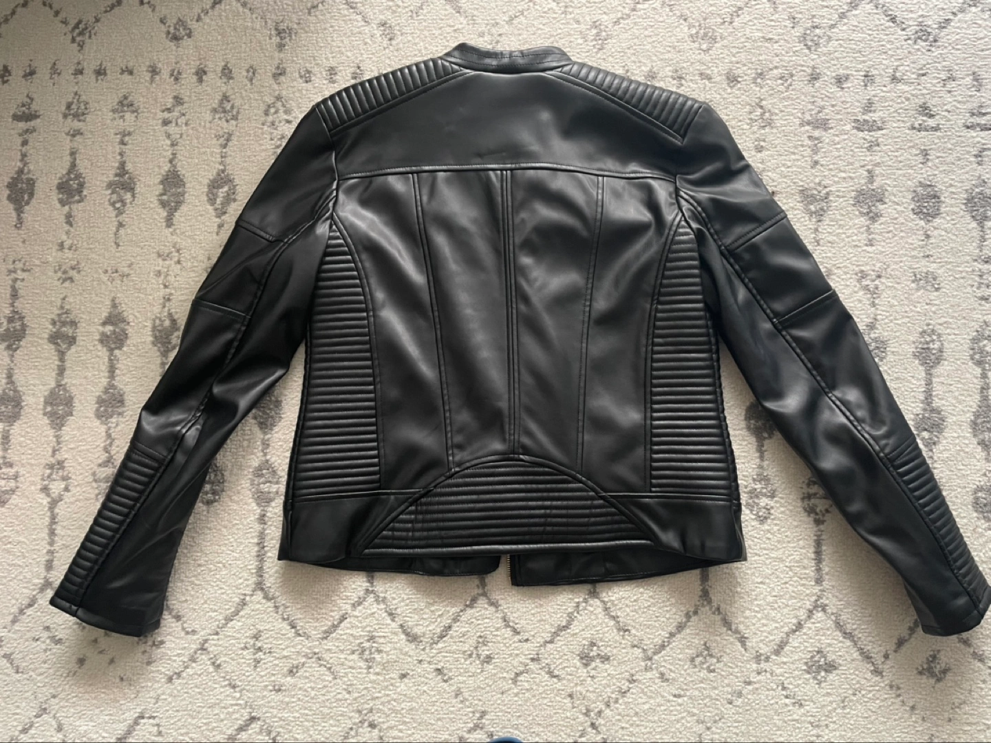 Give this never-worn faux leather jacket a new home! Black jacket with gold zippers. Fully lined interior with soft polyester. Regular Fit. Smooth, asymmetrical zip-fastening. Two external zipper pockets.