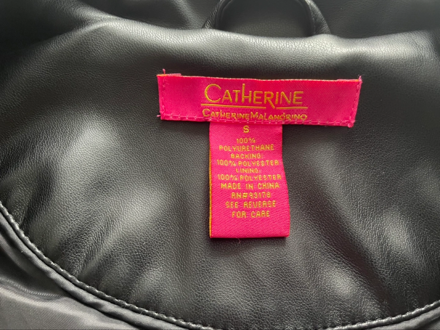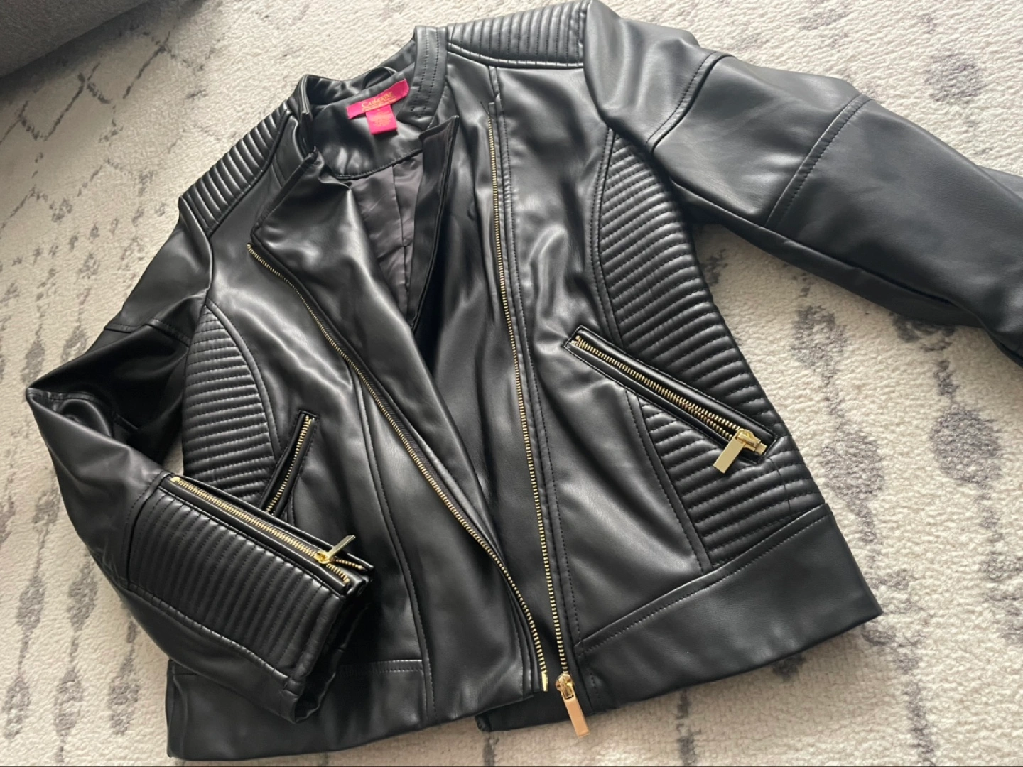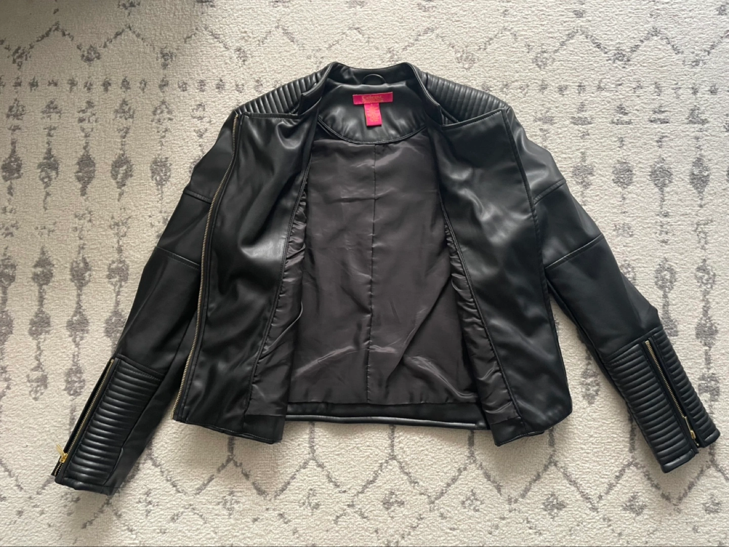 Give this never-worn faux leather jacket a new home! Black jacket with gold zippers. Fully lined interior with soft polyester. Regular Fit. Smooth, asymmetrical zip-fastening. Two external zipper pockets.