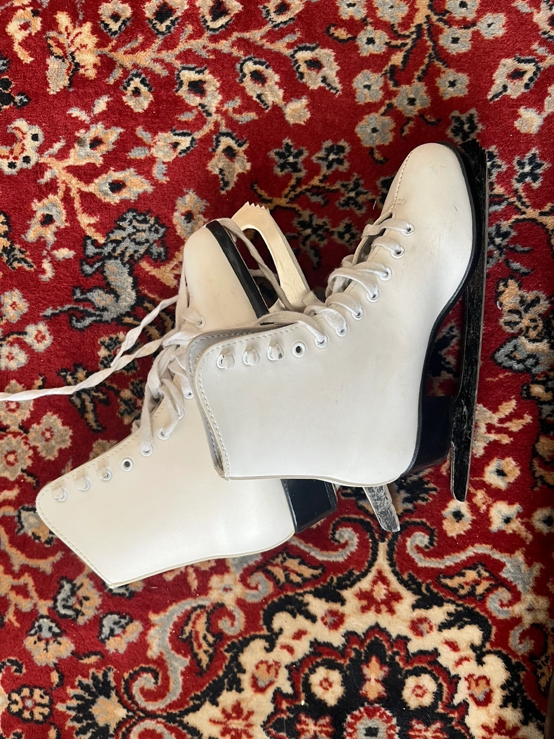 Pair of white figure skates. Lace-up closure. Used condition. Good for recreational skating.