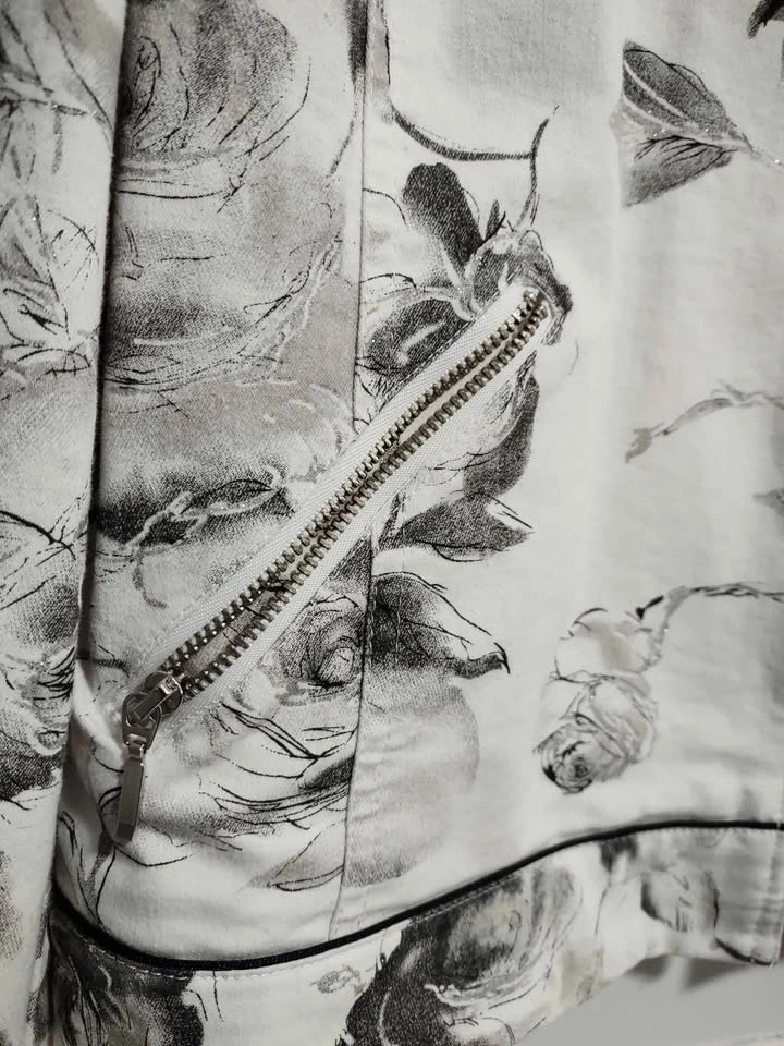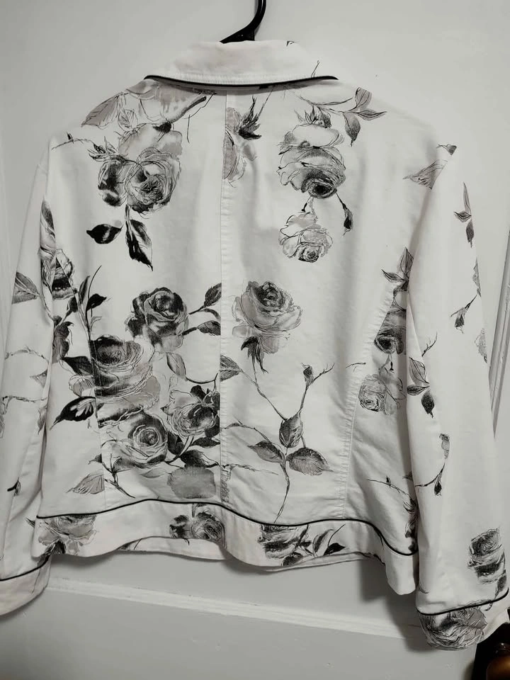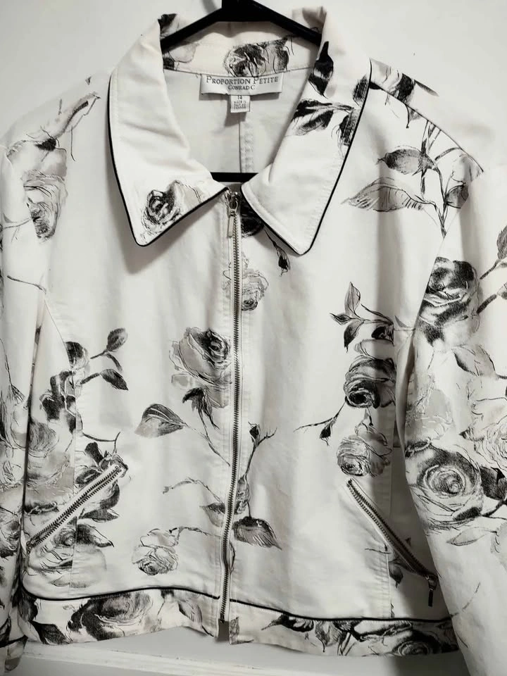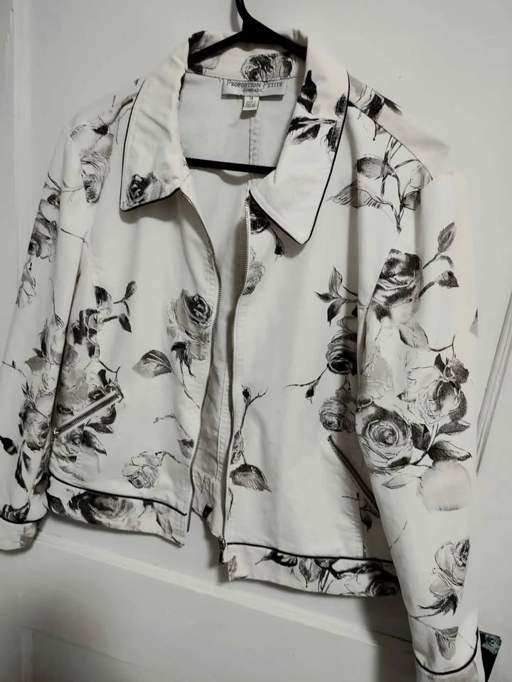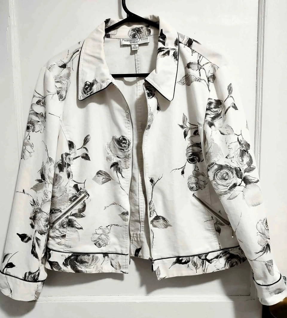 21Brand: Proportion Petite Size: 14 (Petite fit) Color: White with elegant black rose print Details: Full front zipper, side zip pockets, black trim accents Condition: Excellent, gently worn, no flaws