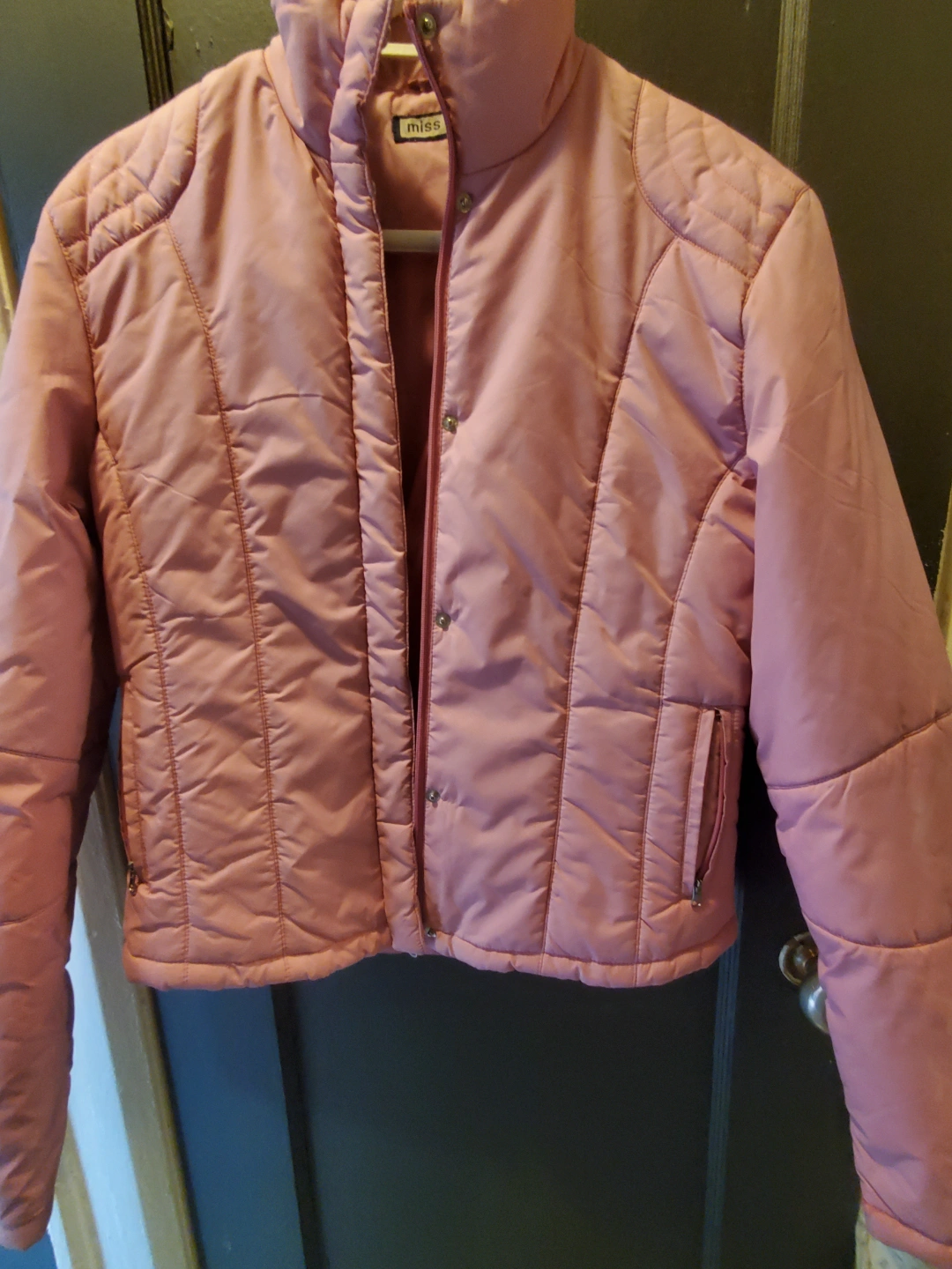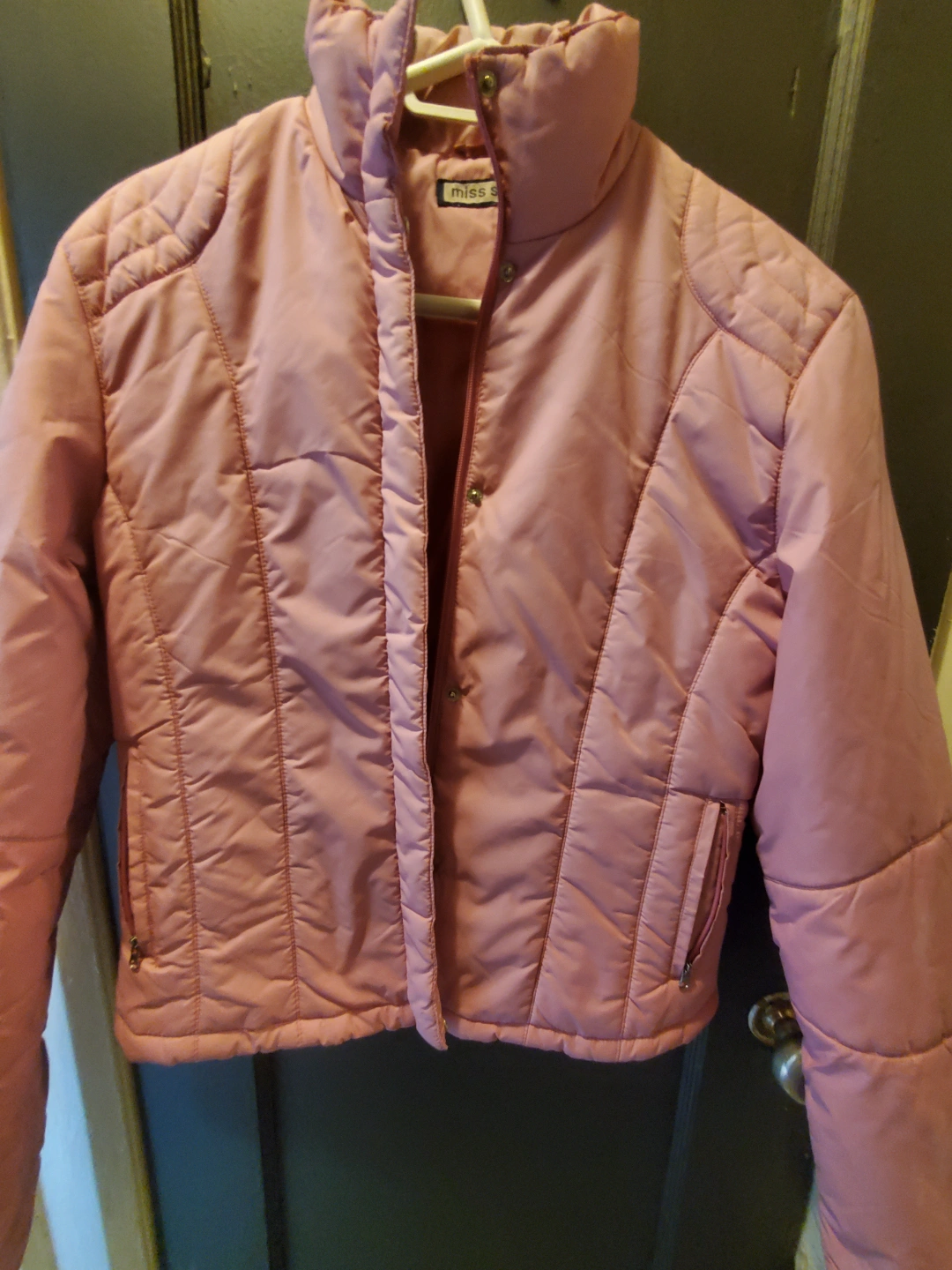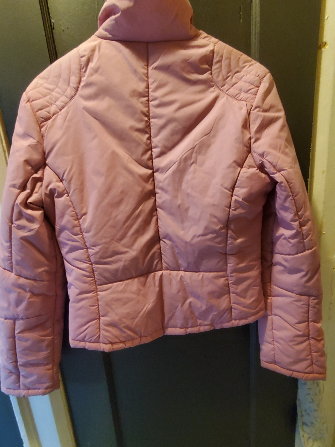 15Women's pink puffer jacket. Zipper and snap closure. Shoulder detailing. Side pockets. Lightweight.