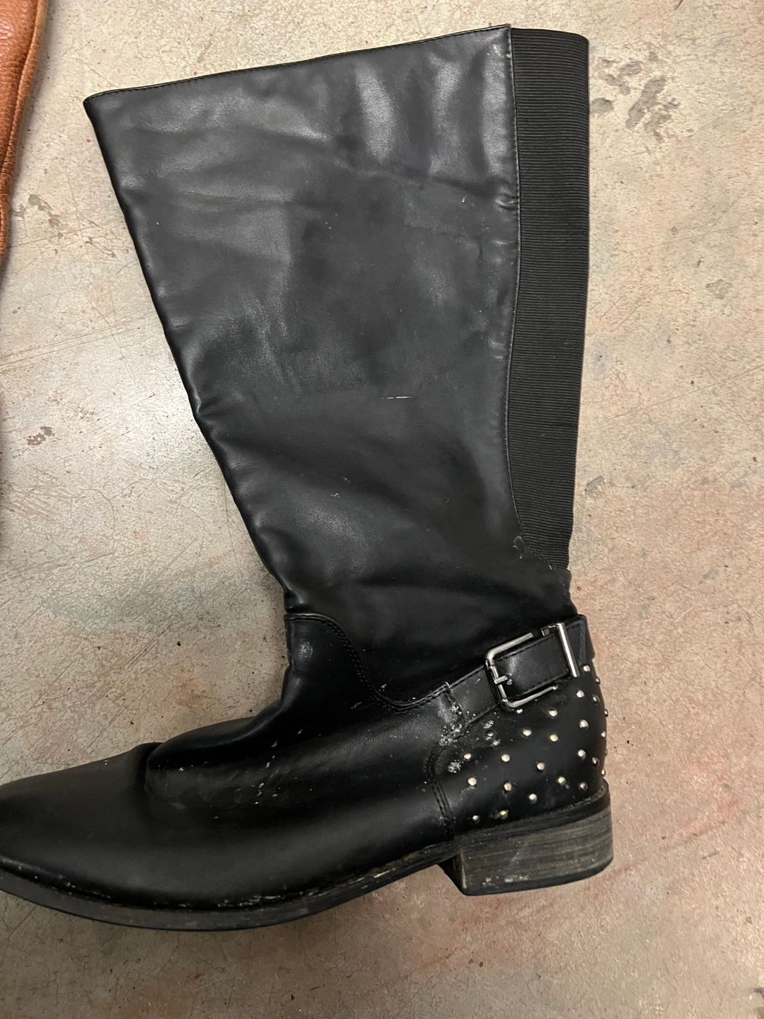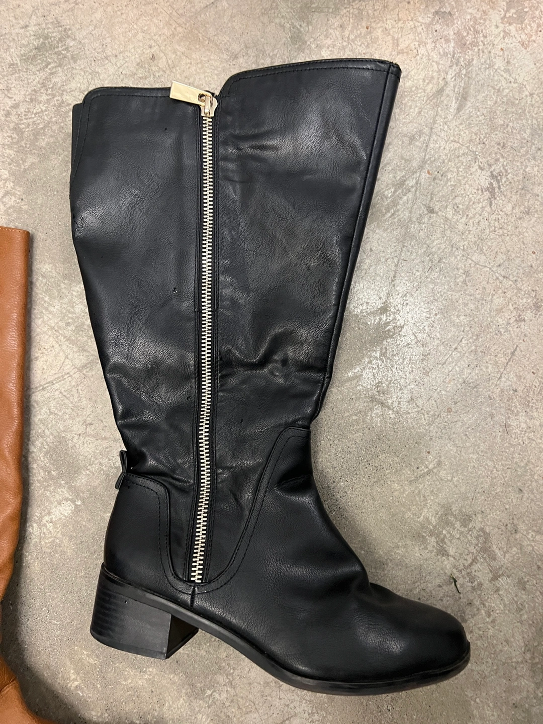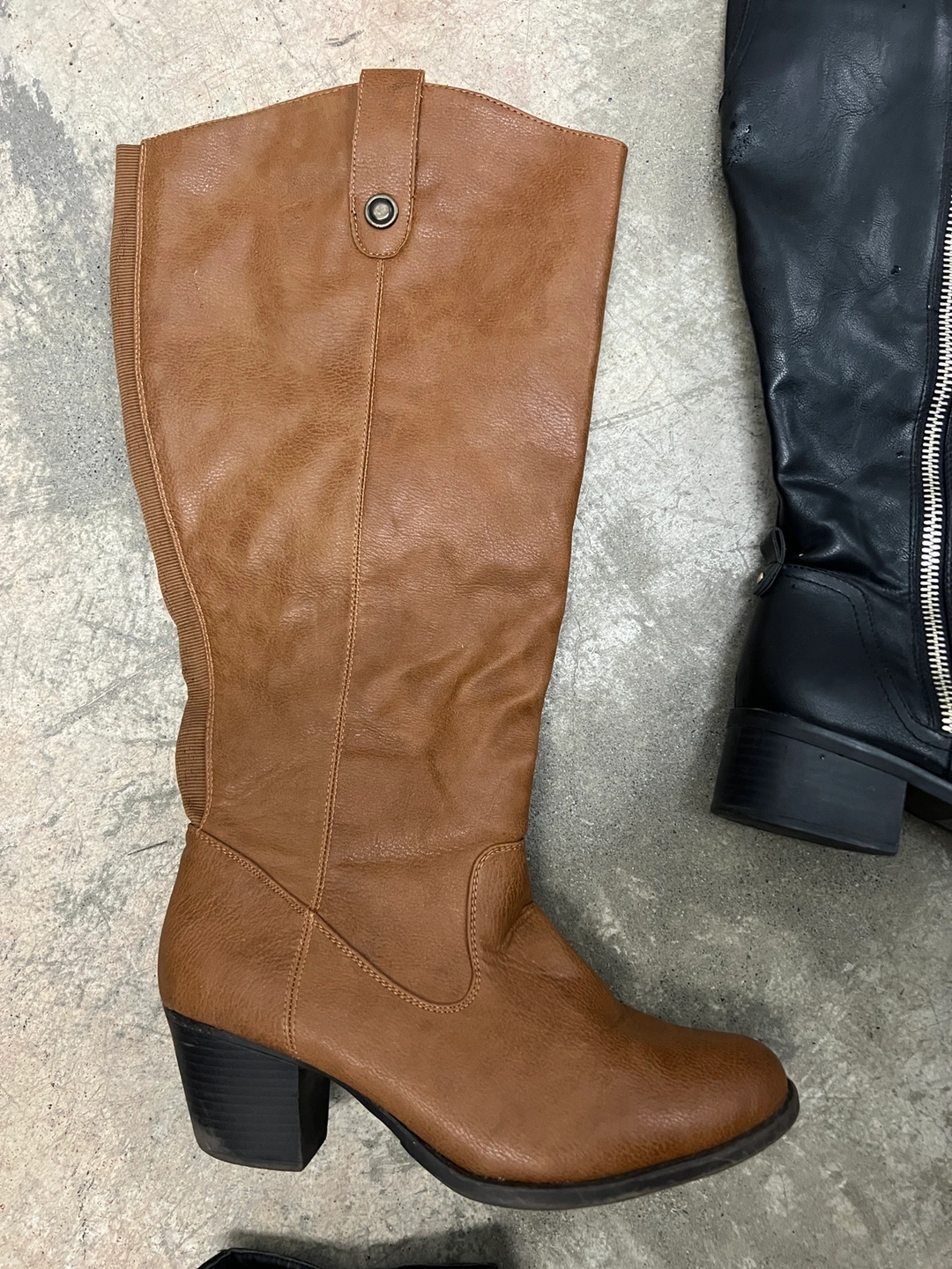 70Two pairs of knee-high boots. One is black with a side zipper and a small heel. The other is brown leather with a small heel and a buckle on the top of the boot. I have lots more