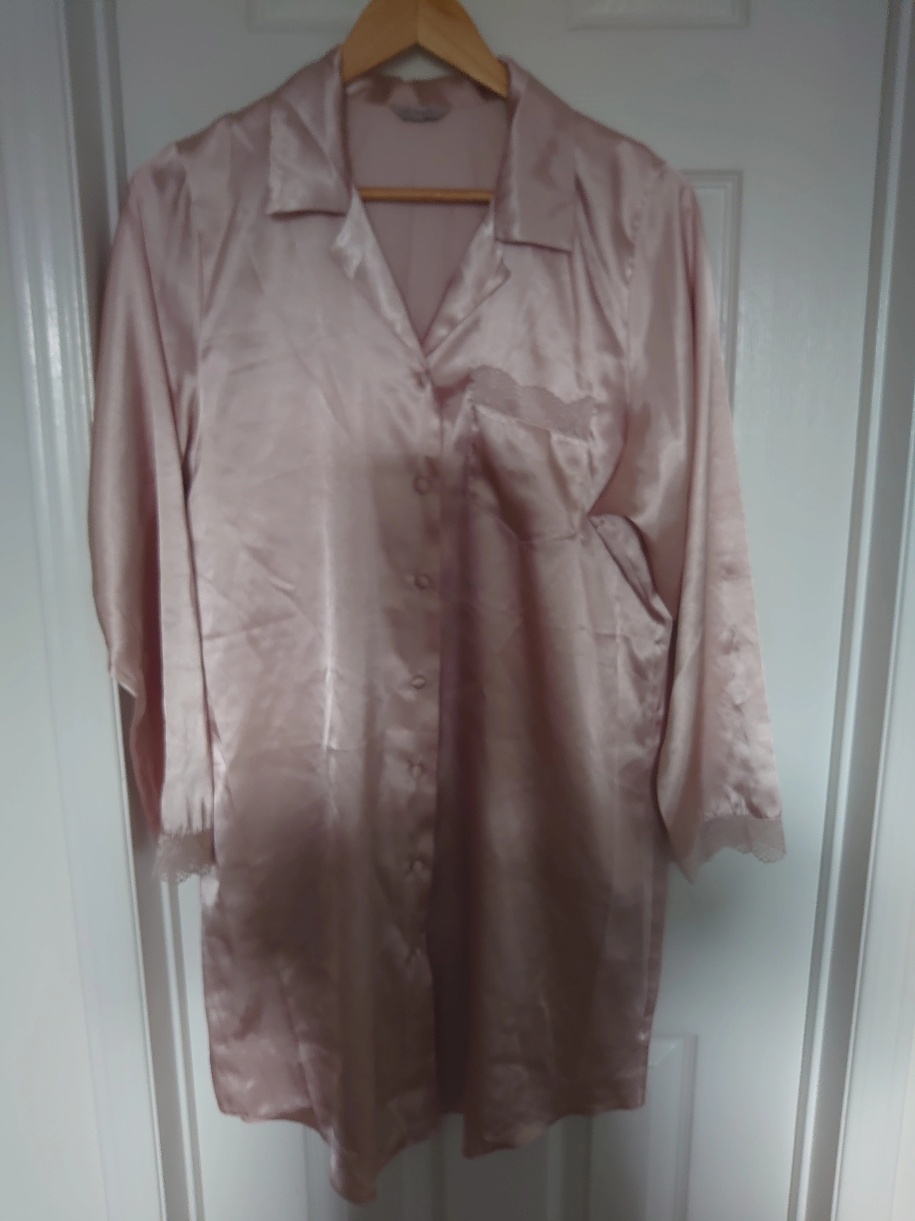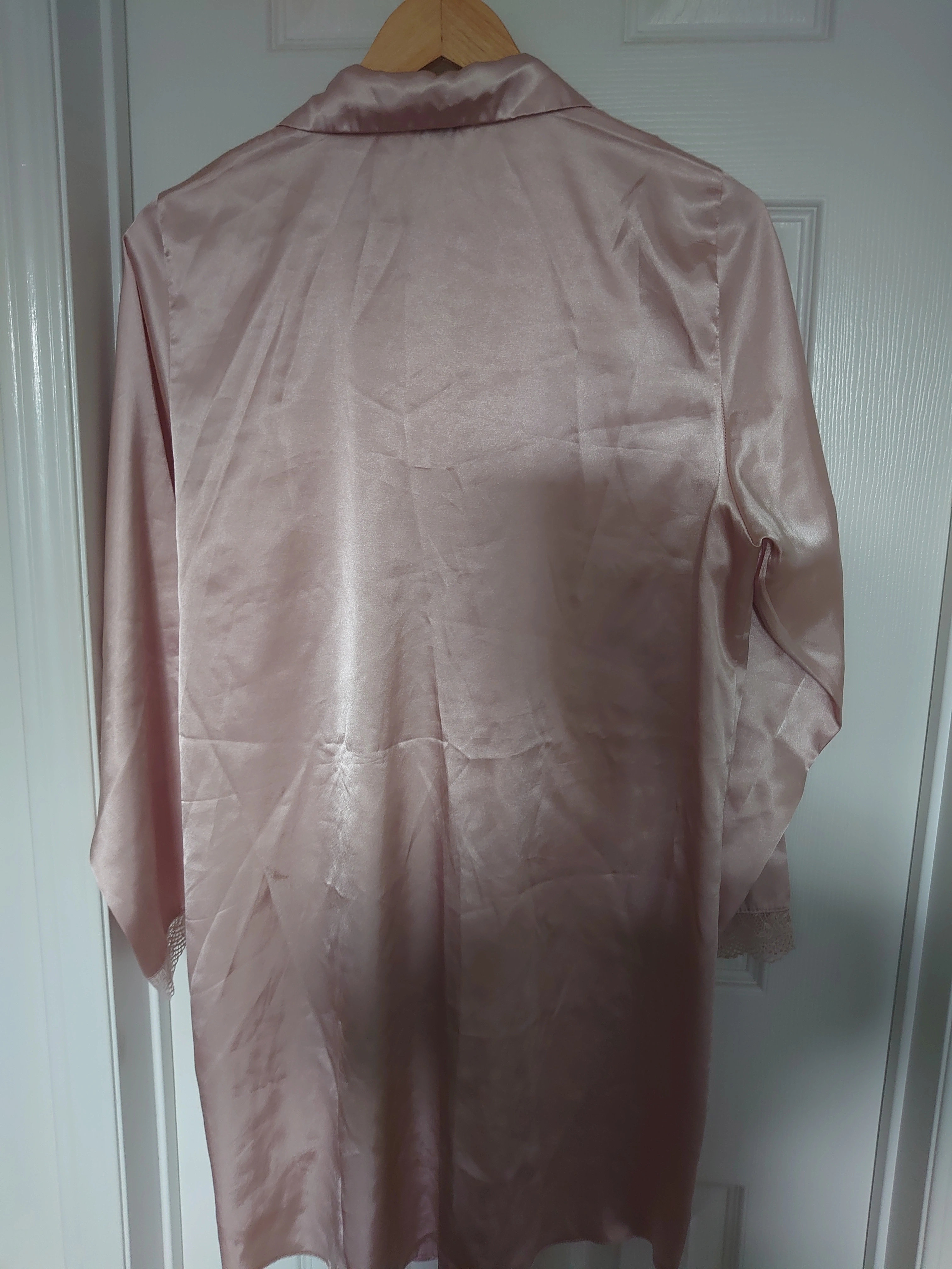 Lovely, satin style fabric. Can be worn as a nightshirt or open over a night dress or PJ's. Soft Blush colour, very feminine