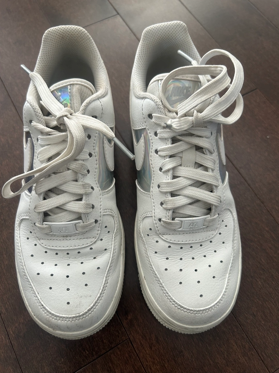 19White leather sneakers with iridescent silver accents. Low-top design. Lace-up closure. Pre-owned.