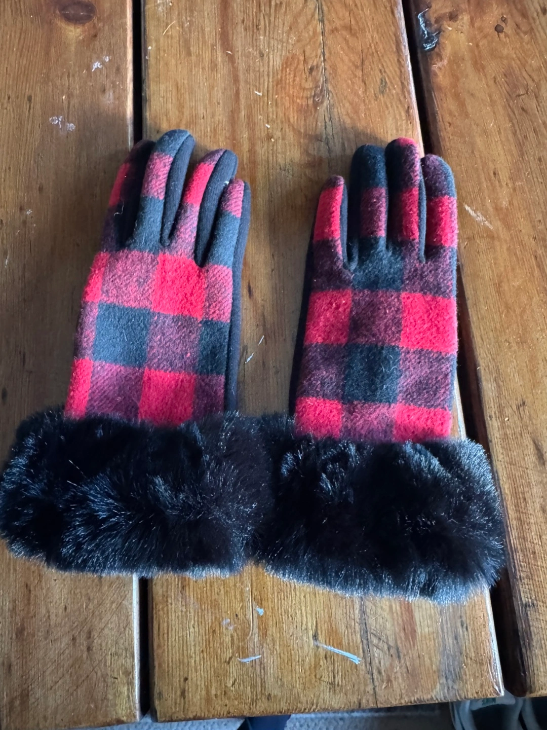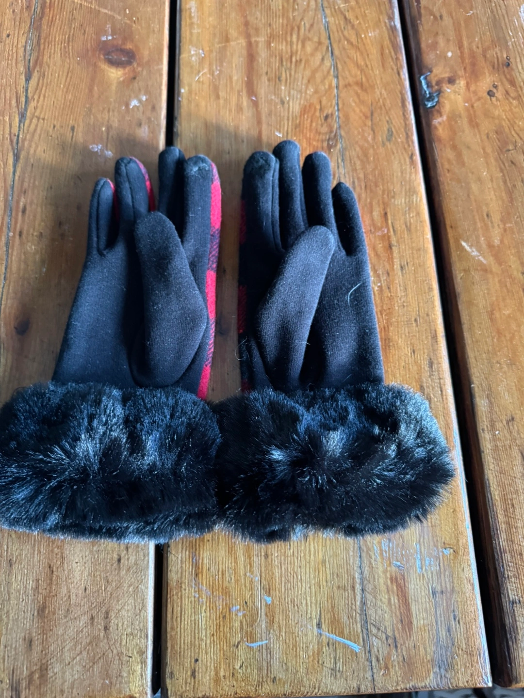 32Warm winter gloves. Red and black plaid design. Faux fur cuffs. Perfect for cold weather.