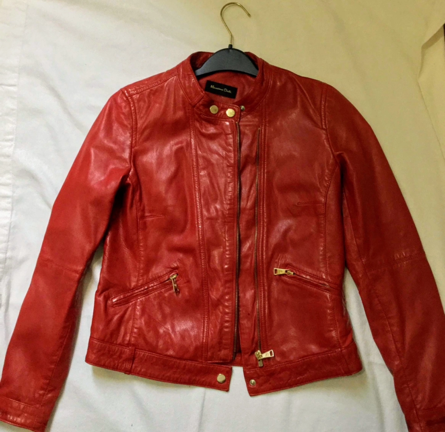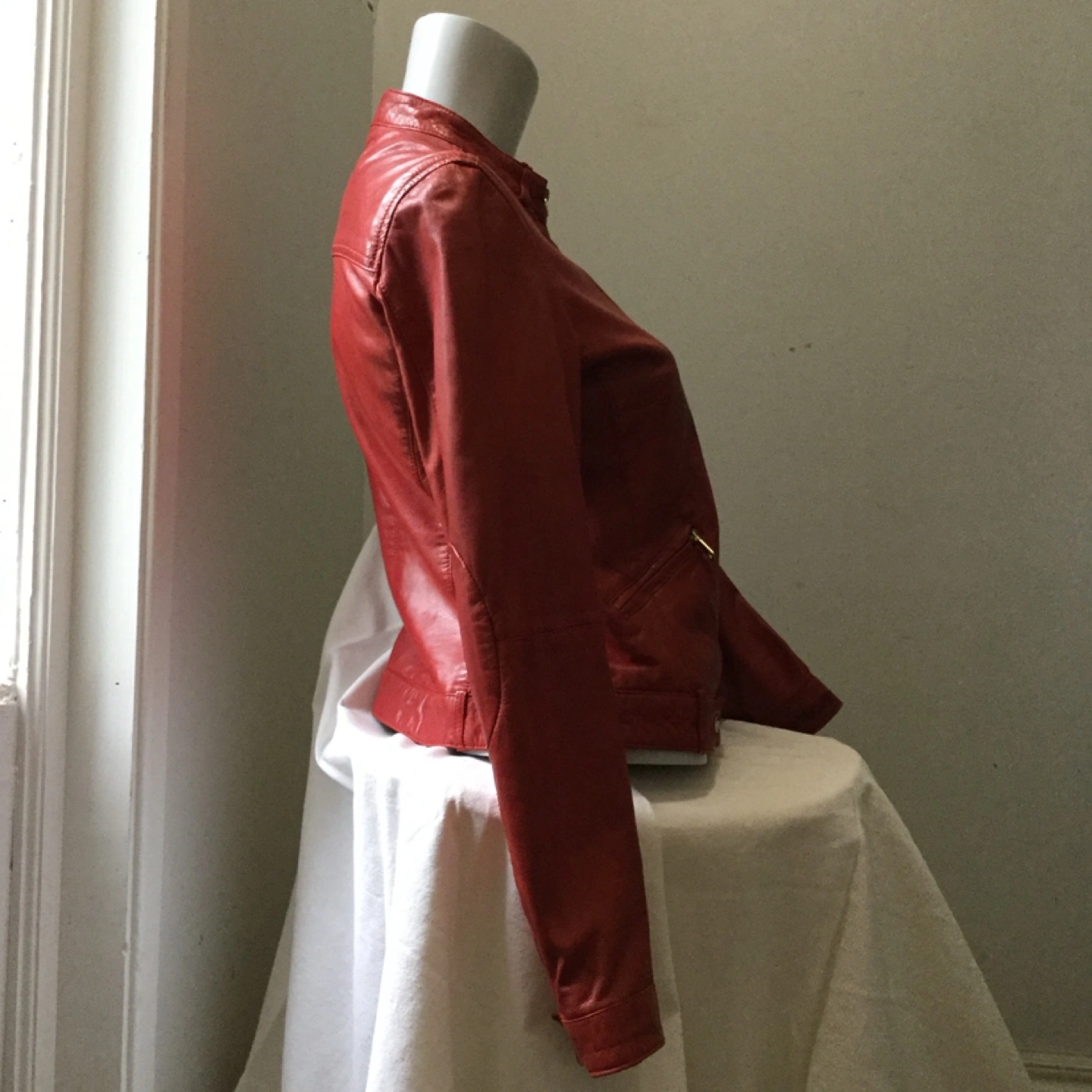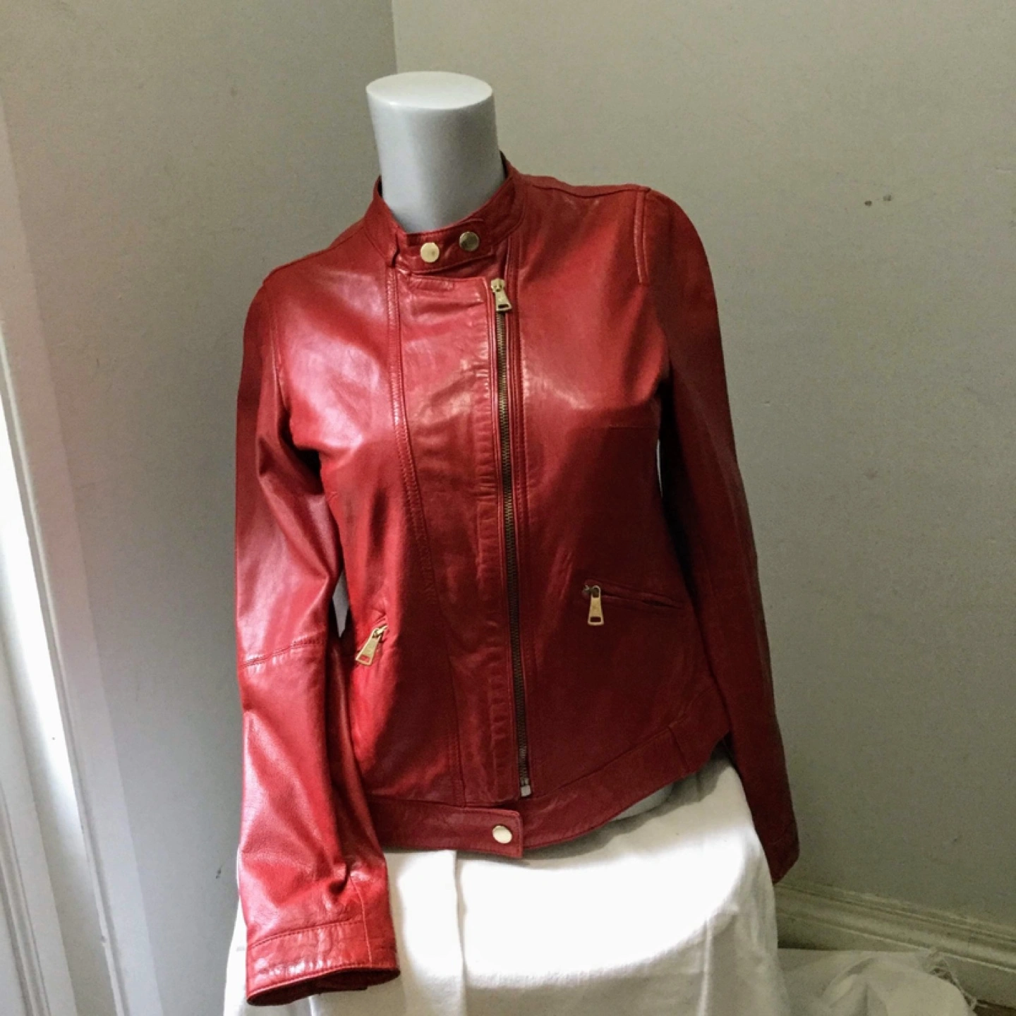 Gorgeous red leather jacket. Zipper closure. Multiple pockets. Very good condition.