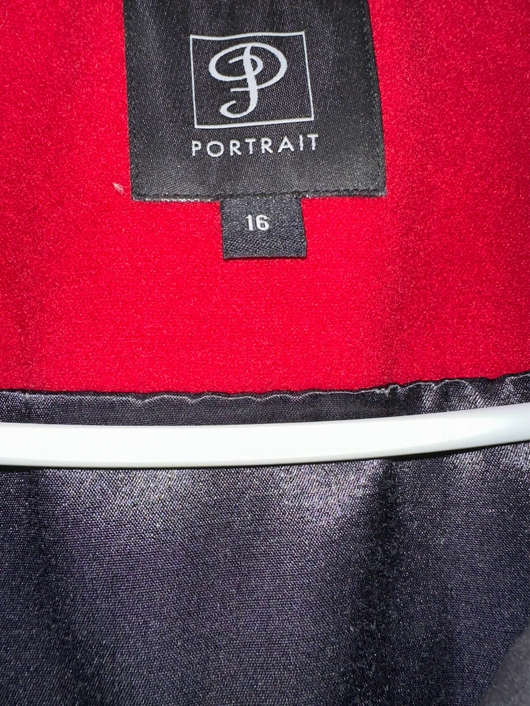 18Red wool coat, size 16. Black collar and accents. Button closure. Lined. Long sleeves.