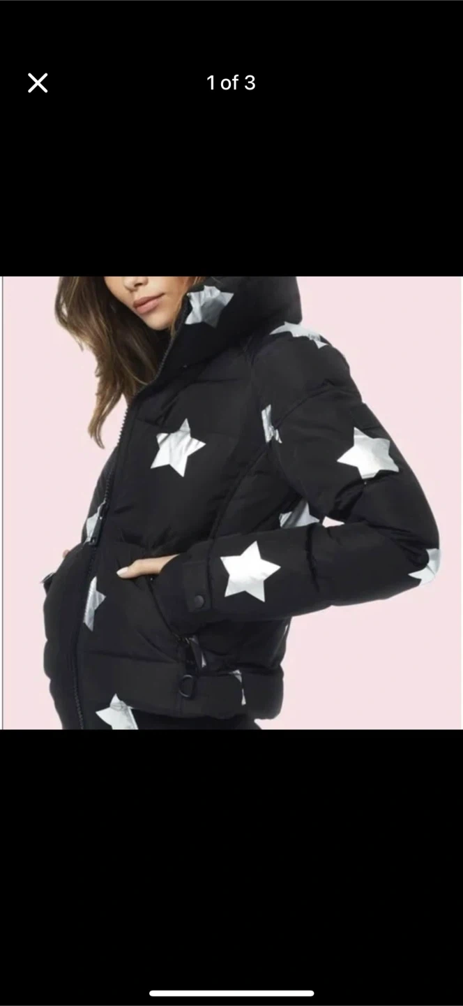 10Selling a stylish Sam black down puffer jacket. It features a unique star design and is perfect for staying warm during the colder months. The jacket is in great condition and ready for a new owner!