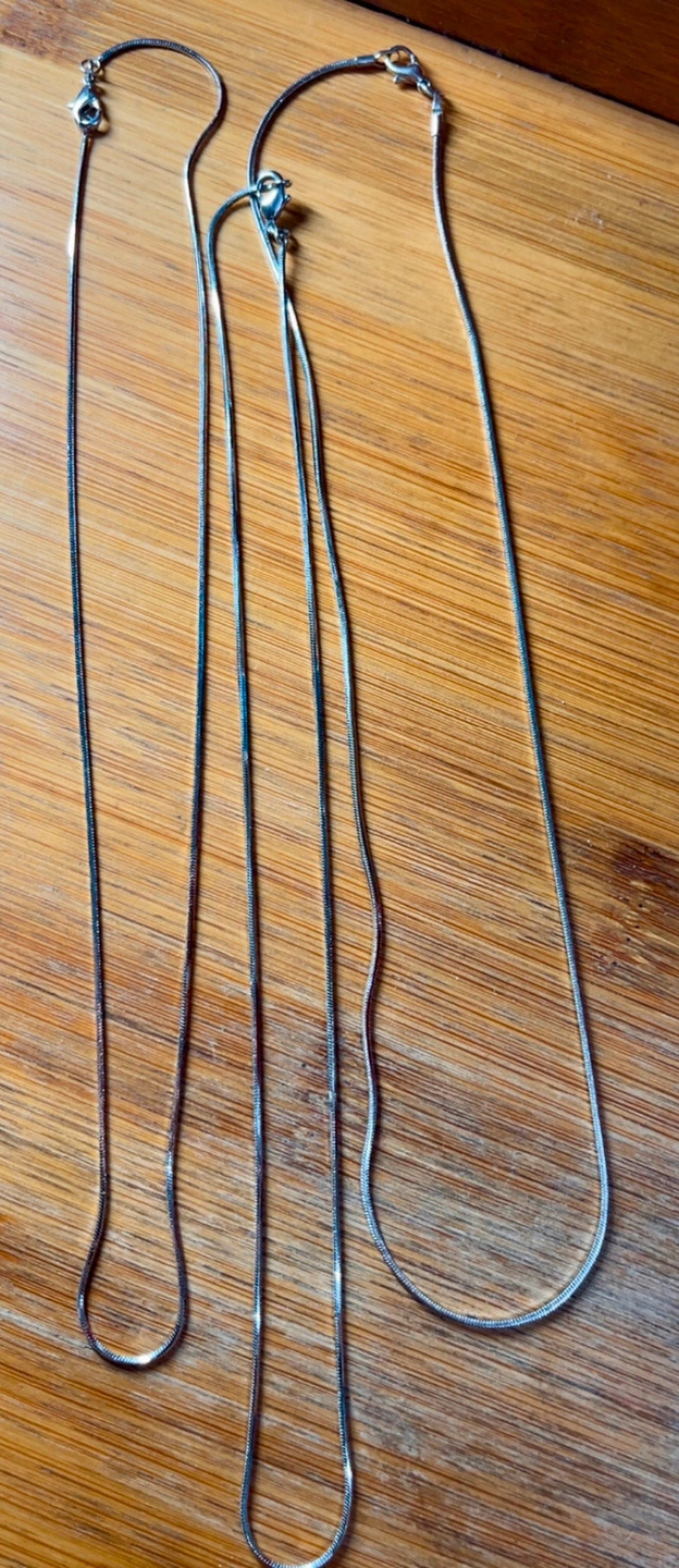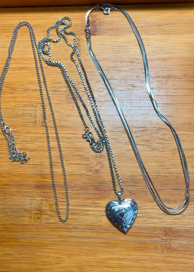 18Elevate your look instantly with this stunning, high-quality silver-tone set. The Bundle: • Heart Locket: Opens to hold a photo or a tiny momento. Features a very sturdy chain. - $25 • 4 sterling silver Chains: BRAND NEW, never worn, and anti-tarnish—they keep their shine! - $48 for 4, $12 each • One silver toned, long chain with clasp. (perfect for adding a locket) - $5 Perfect for layering or wearing individually. Individual prices listed above. Total valued at $80, selling the bundle for a discount at $65. Never worn before. Pickup only. Serious inquiries only.