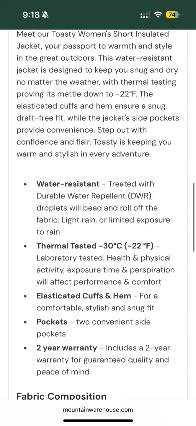 171Stay warm and stylish with the Mountain Warehouse Toasty Women's Short Insulated Jacket! This water-resistant jacket is designed to keep you snug and dry in the great outdoors. It's been thermally tested to -30°C (-22°F). - Water-resistant with Durable Water Repellent (DWR) treatment - Thermal tested to -30°C (-22°F) Bought for 100$ last winter