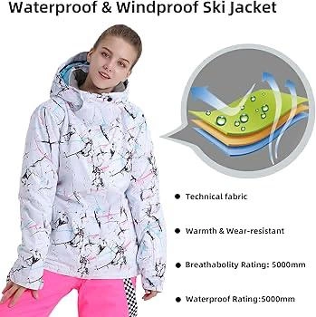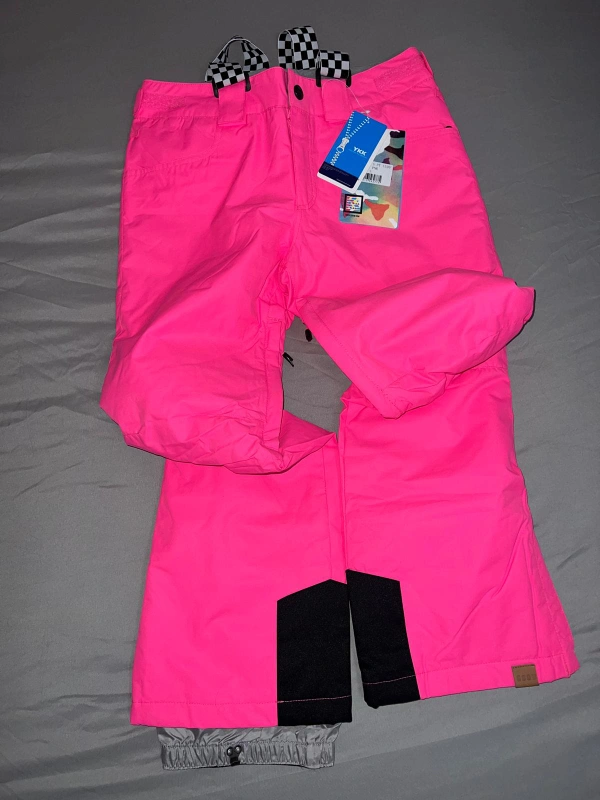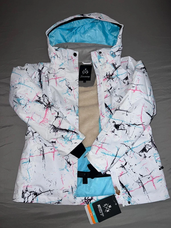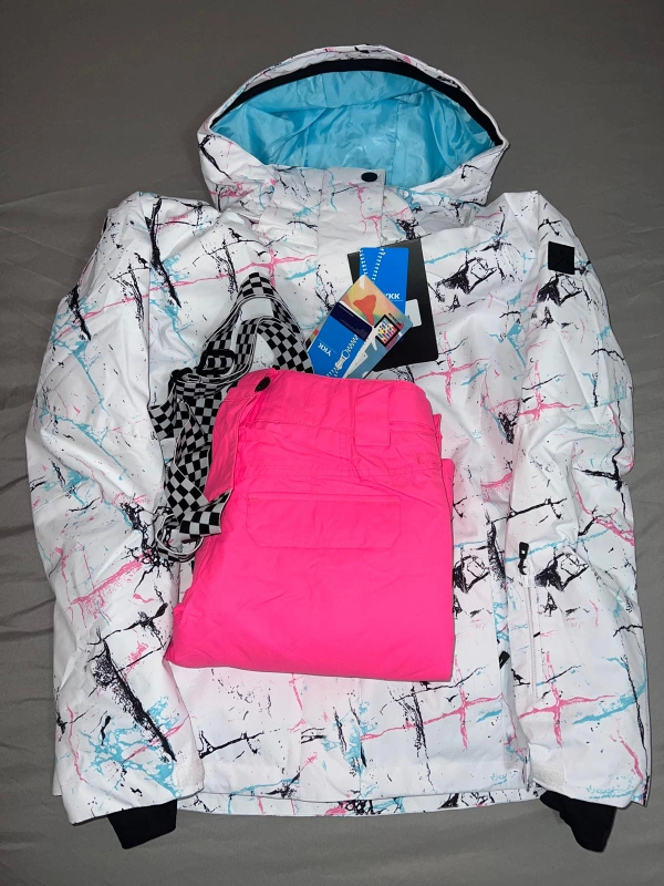 22Women's SN brand ski jacket and pants set. Marble print jacket, bright pink pants. Waterproof and windproof. Jacket features a hood and multiple pockets. Pants have suspenders. Excellent condition, never worn.