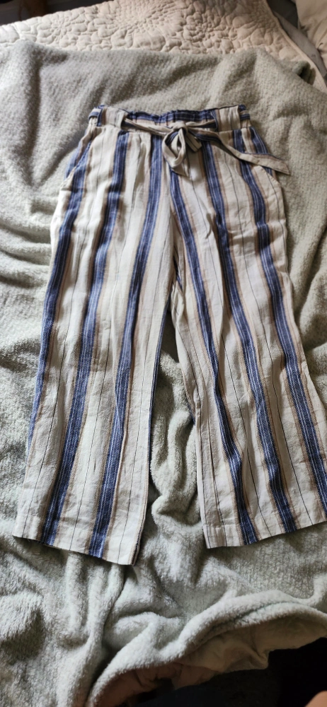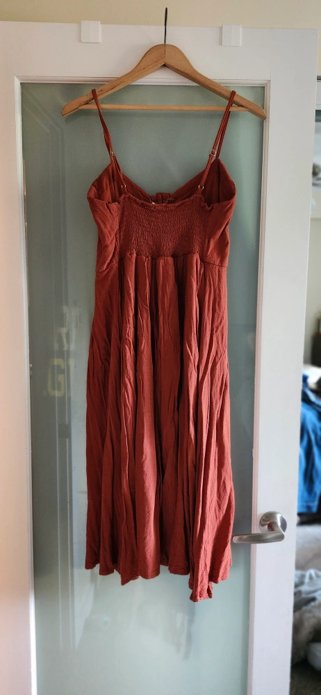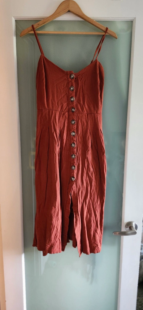 23Dynamite denim one piece, adjustable shoulder straps, capri length, good condition, size medium, $15 Burnt Orange summer dress, small flaw as seen in pic, unknown brand and size but fits like a medium, $10 Summer pants, size large buts fits like medium/large, worn once, $15