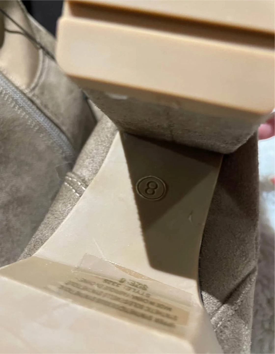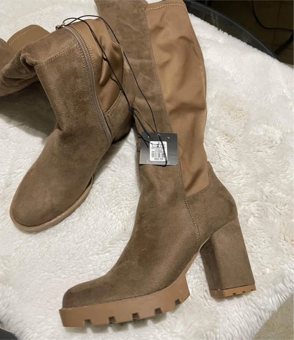 New with tags. Taupe suede-like over-the-knee boots. Block heel. Size 8. Back zipper closure.