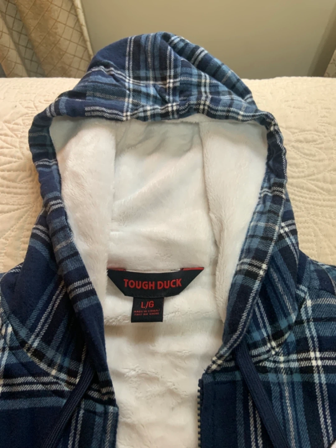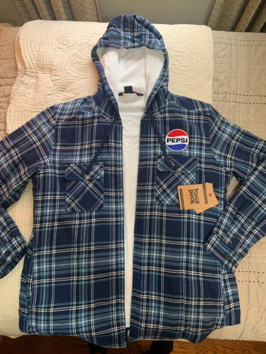 96• Main Intersections are HURONTARIO•STEELES just before downtown Brampton • NEW with Tags • Pepsi Logo • TOUGH DUCK ( eat. 1939 ) • Women’s size Large • Also fits Men size Small•Medium • 100% Brushed Cotton Yarn Dyed flannel double preshrunk • BLUES • Zippered • Pockets • $50 • Peel Village Area Cozy up in this Tough Duck flannel hoodie featuring a Pepsi logo! It's a size large and has a soft, warm lining. Perfect for those chilly Canadian evenings!