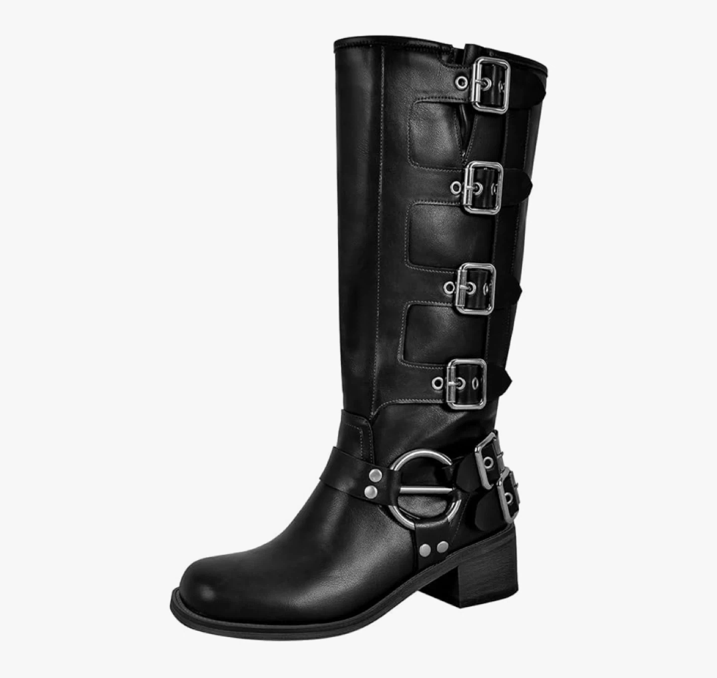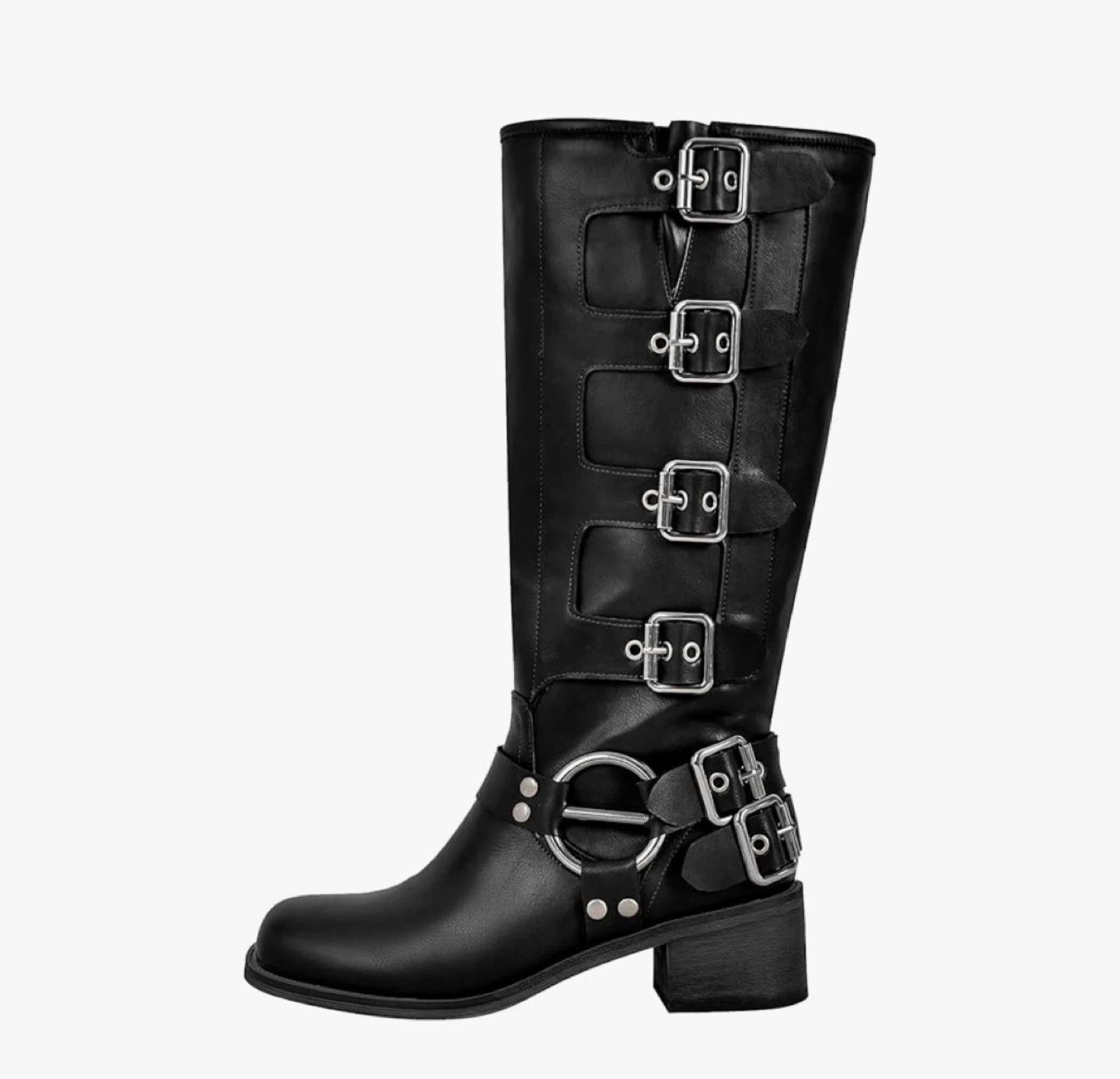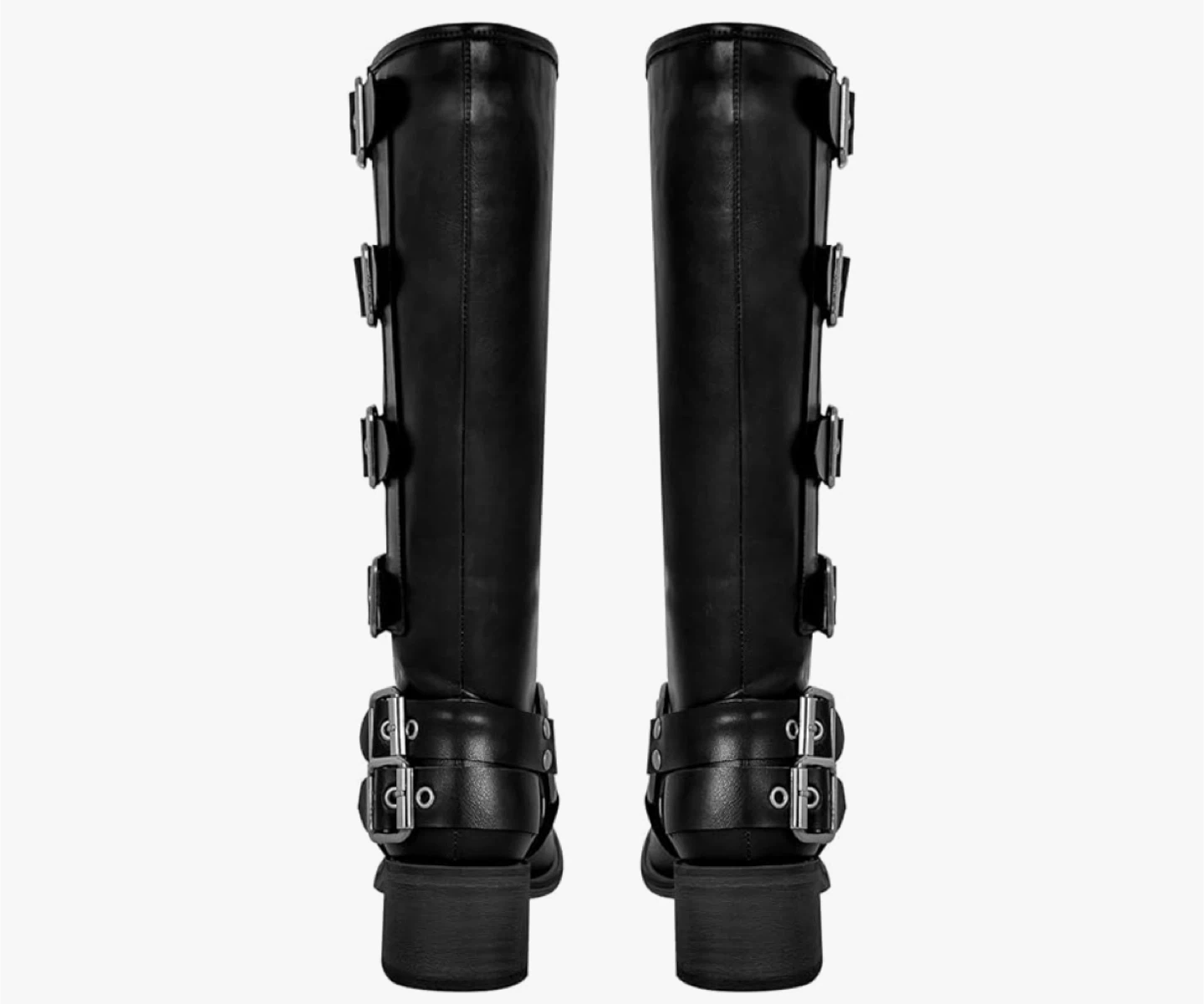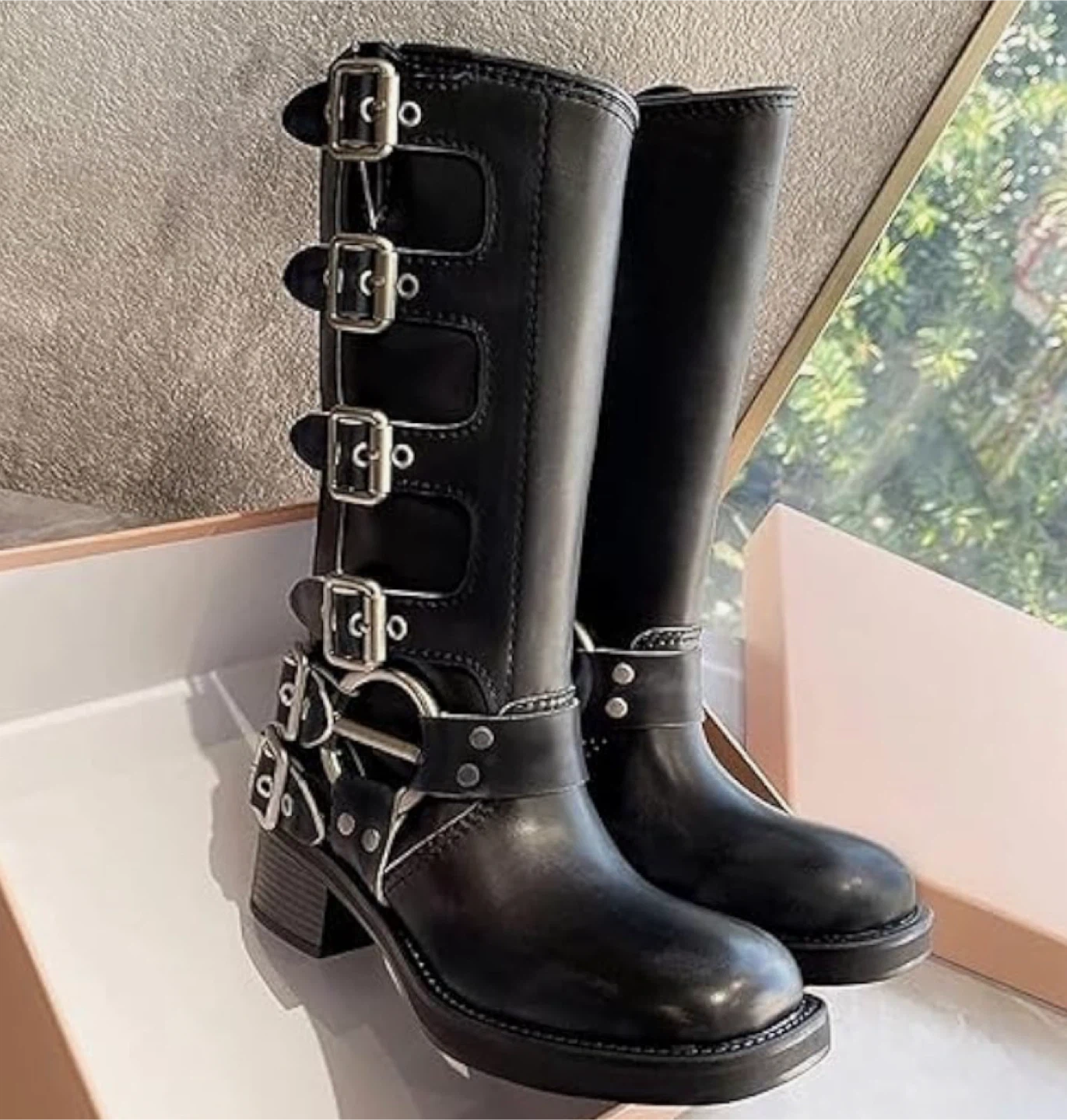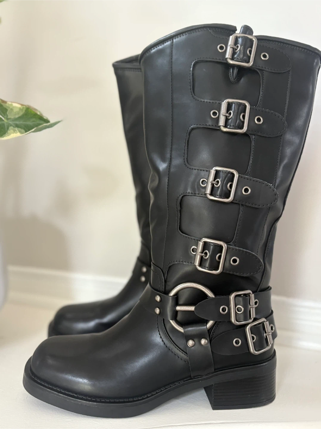Women's Wide Calf Riding Boots - New in box Square Toe Chunky Heel Black Size : 11 Wide calf Calf height Sole is rubber Vegan leather Adjustable Buckle Straps: Designed with multiple adjustable straps for a trendy. Pull-On Design Meet up & cash only pls Meet up is in Nobleton