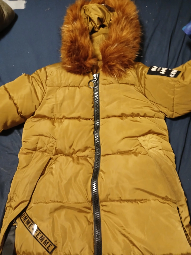 16Warm down filled women's winter coat Hooded. Size medium. Glossy taupe color. Arm patch says Boy Steel in the hour of Chaos. can be taken of with stitch remover