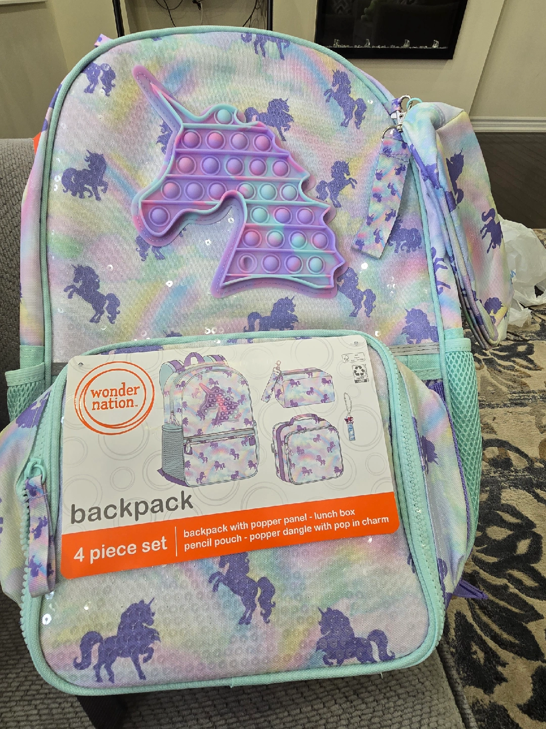 Check out this brand new Wonder Nation 4-piece backpack set! It features a cute unicorn design and includes a backpack with popper panel, a lunch box, a pencil pouch, and a popper dangle with a pop in charm! Perfect for your little one's school days or outings