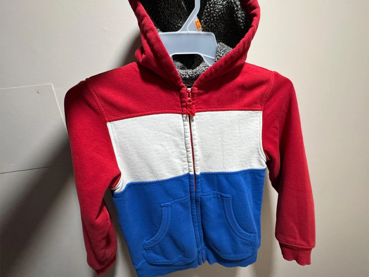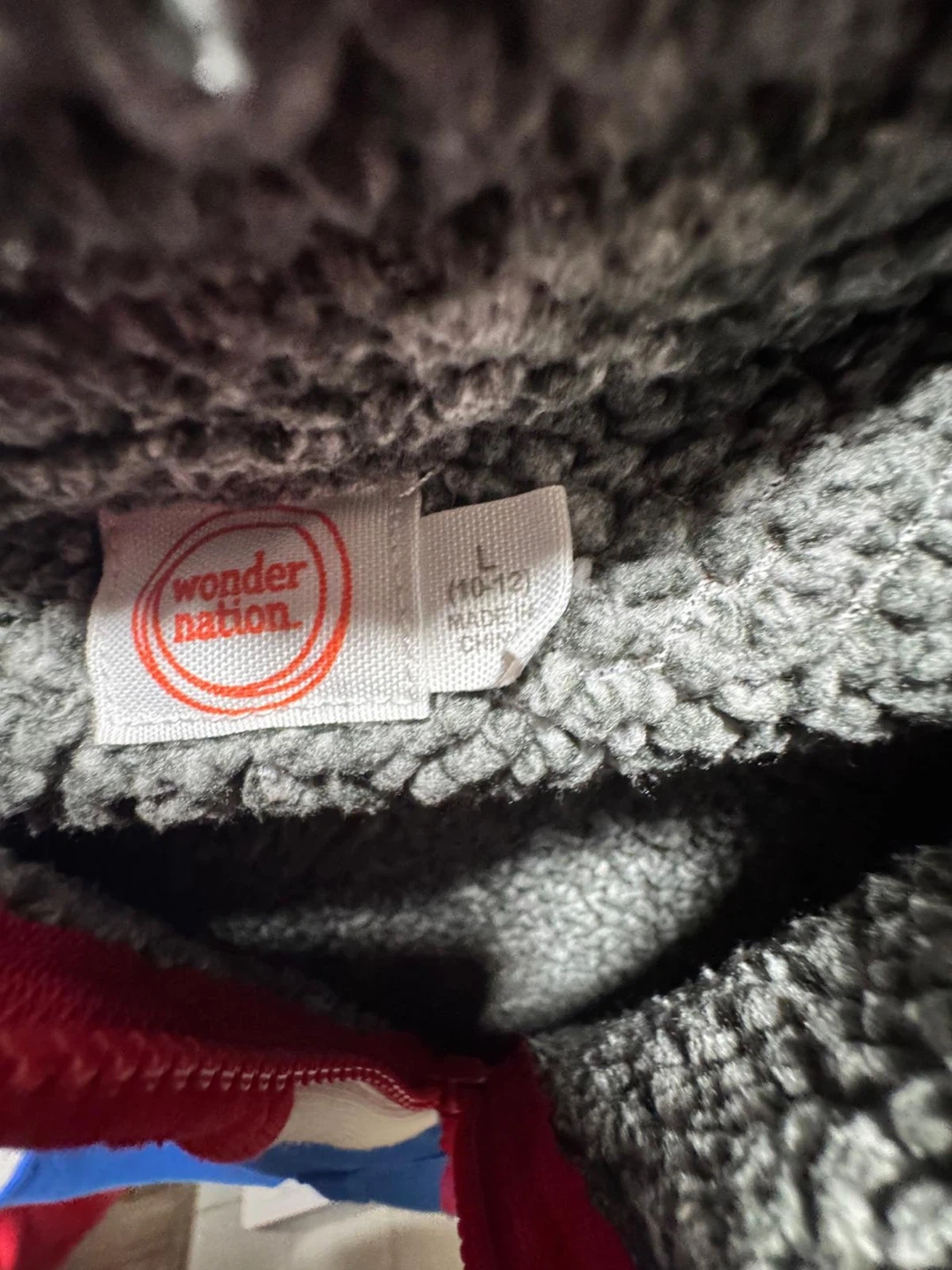 12Cozy up your little one with this Wonder Nation fleece hoodie! It's a size L (10-12) and features a fun red, white, and blue colour block design. Perfect for keeping them warm on chilly days!