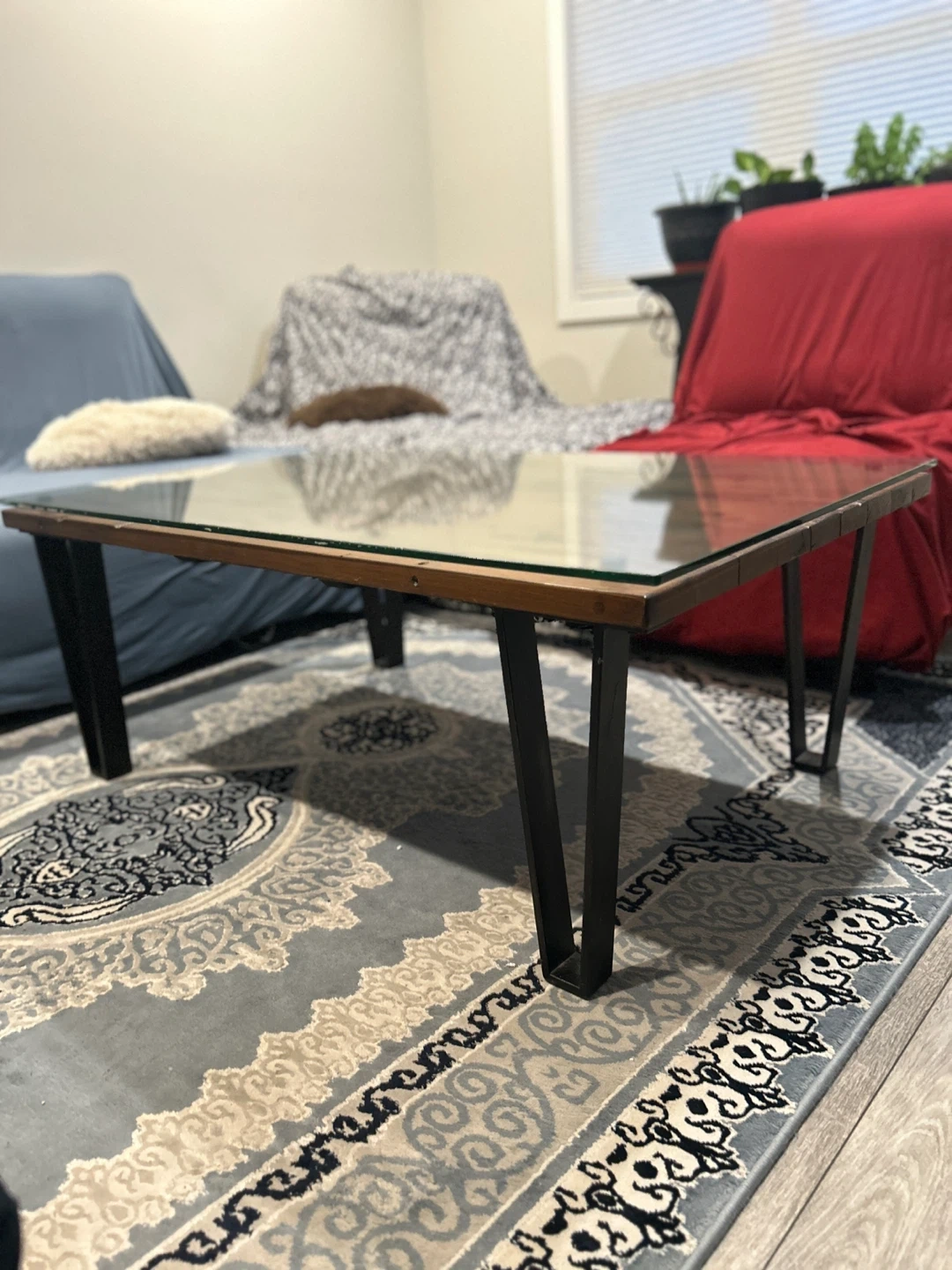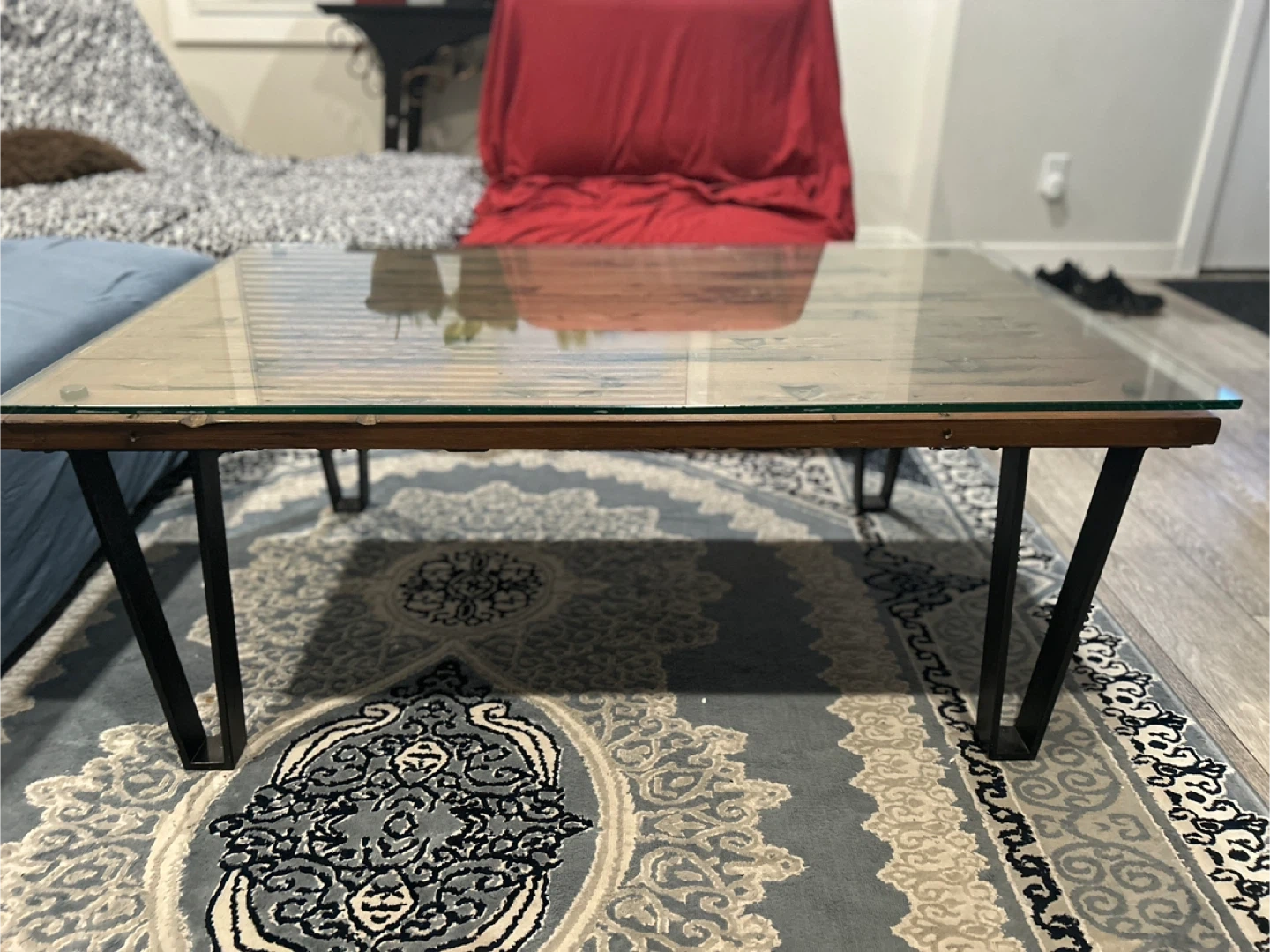21This coffee table is in excellent condition and has barely been used in our home. It features metal legs, a solid wood base, and a thick glass top, giving it a sturdy and modern look. Important: The glass top is not attached to the base, so you will need glass clamps (not included) to secure it properly. The measurements are provided in the third picture for your reference.