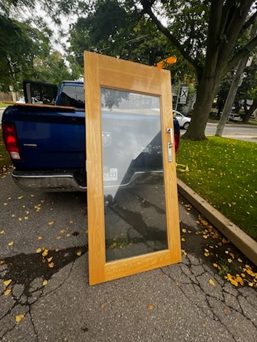 62270 . Solid wood door with glass. Baldwin lock for one of the doors (without key)Double glass they are interior doors and 3 feet W and 81 H