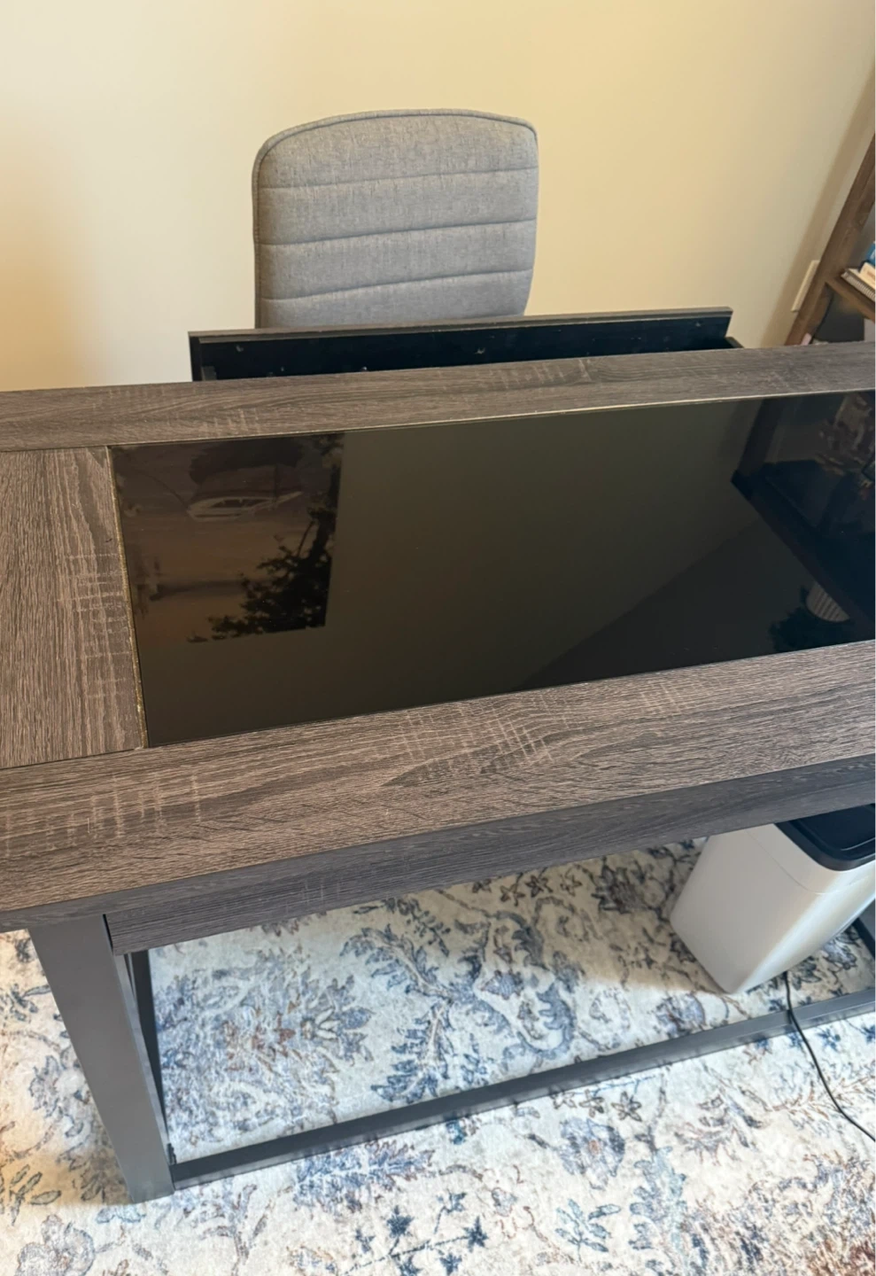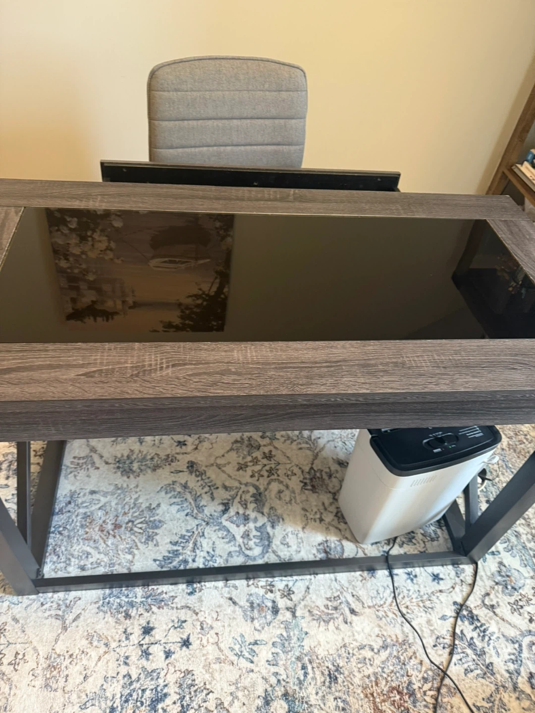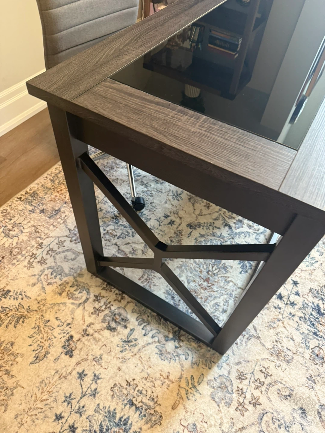 Selling a wood desk with a glass top. It's in great condition and would be perfect for a home office or study space. The dark wood frame gives it a modern look, and the glass top is easy to clean. Can include office chair for 50.00