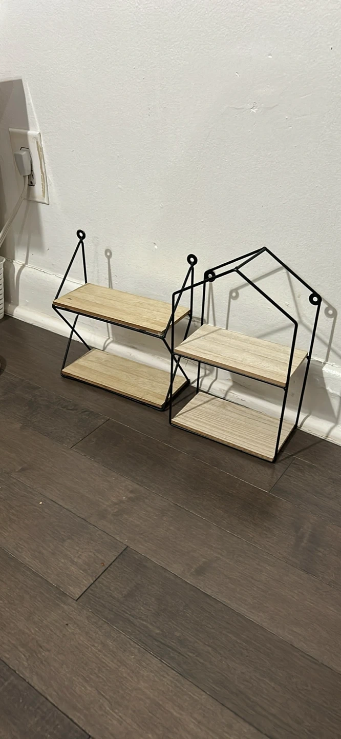 182$5 each. These are some cute shelves that would look great in any room! They have a black metal frame with light wood shelves. They're perfect for displaying plants, books, or other small items