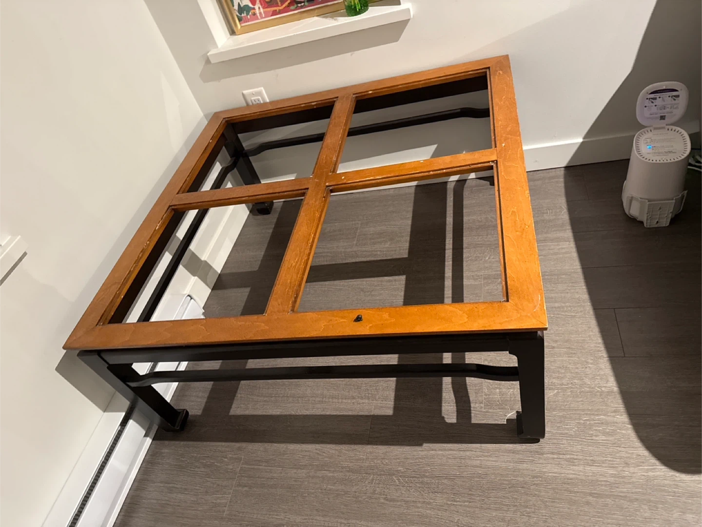Selling a coffee table frame with a wooden top and black legs. It's in good condition and ready for a new home! The frame is sturdy and would be perfect for a DIY project or to replace a damaged table top
