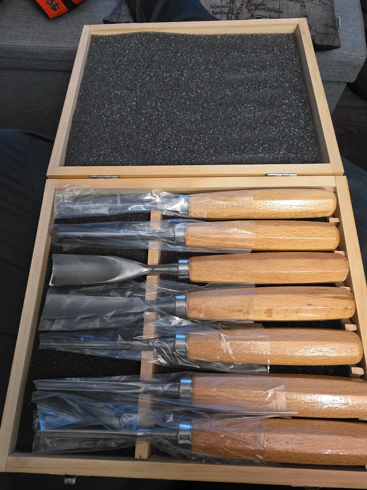 15Selling a brand new set of wood carving chisels! They come in a wooden box with a foam insert to keep everything organized and protected. Each chisel is individually wrapped in plastic, ensuring they're in perfect condition. Great for woodworking enthusiasts or anyone looking to start a new hobby