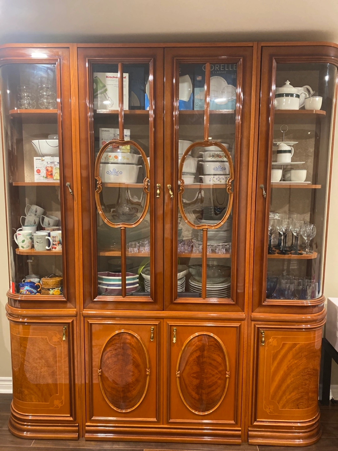 128Selling a wood china cabinet in good condition. It features glass doors on the top section and solid wood doors on the bottom. Perfect for displaying your favourite dishes and glassware!