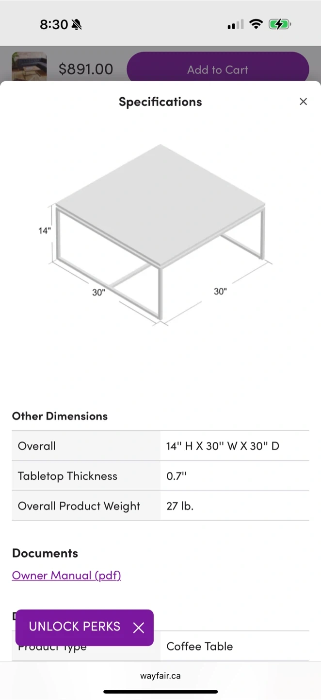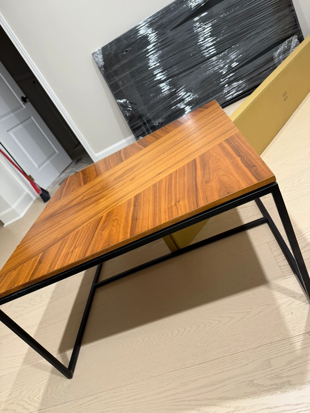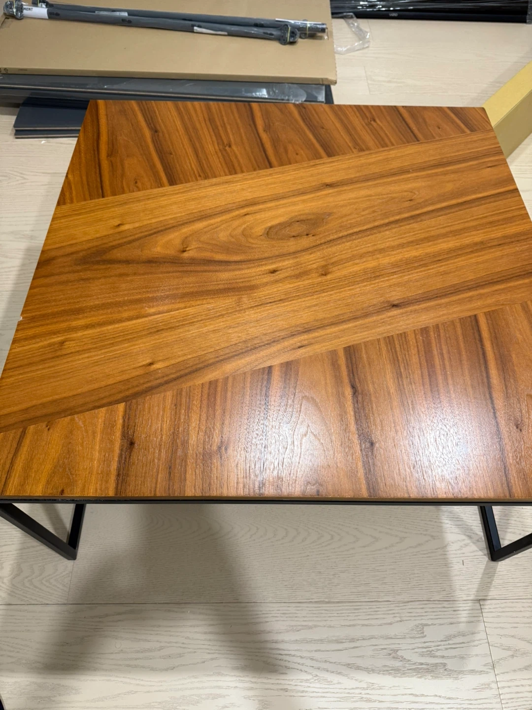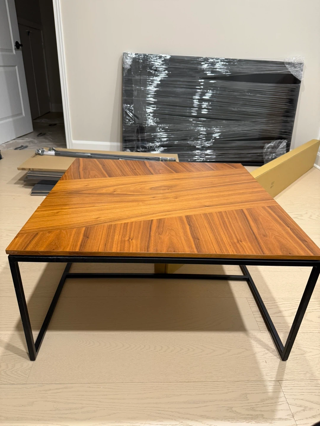 Selling a stylish wood coffee table with a sleek black metal frame! It's in great shape and would look great in any living room. Dimensions: - Overall: 14" H x 30" W x 30" D - Tabletop Thickness: 0.7" - Overall Product Weight: 27 lb