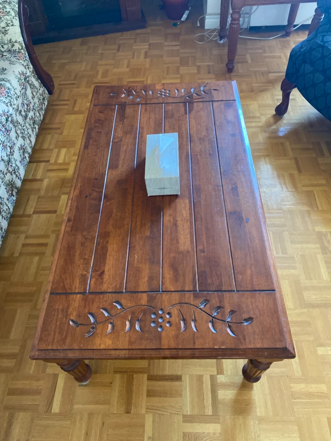 Selling a wood coffee table. It's in great shape and would look great in any living room or den. It's a solid piece of furniture, well-built and ready for a new home 2 end tables included
