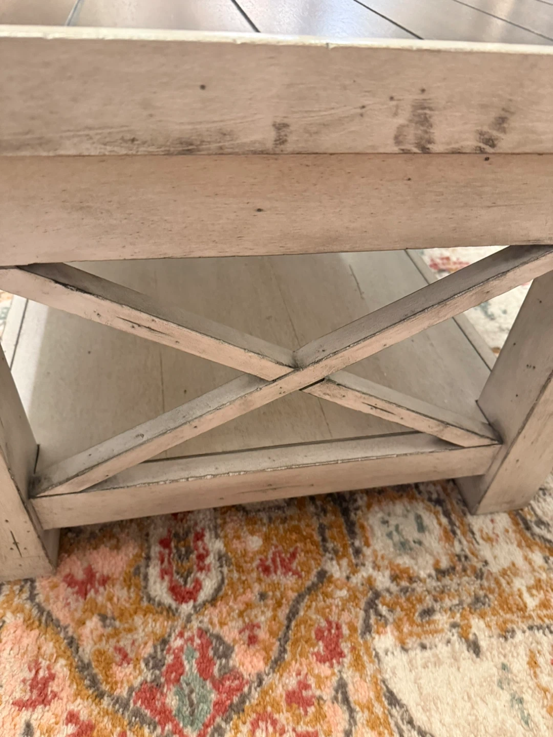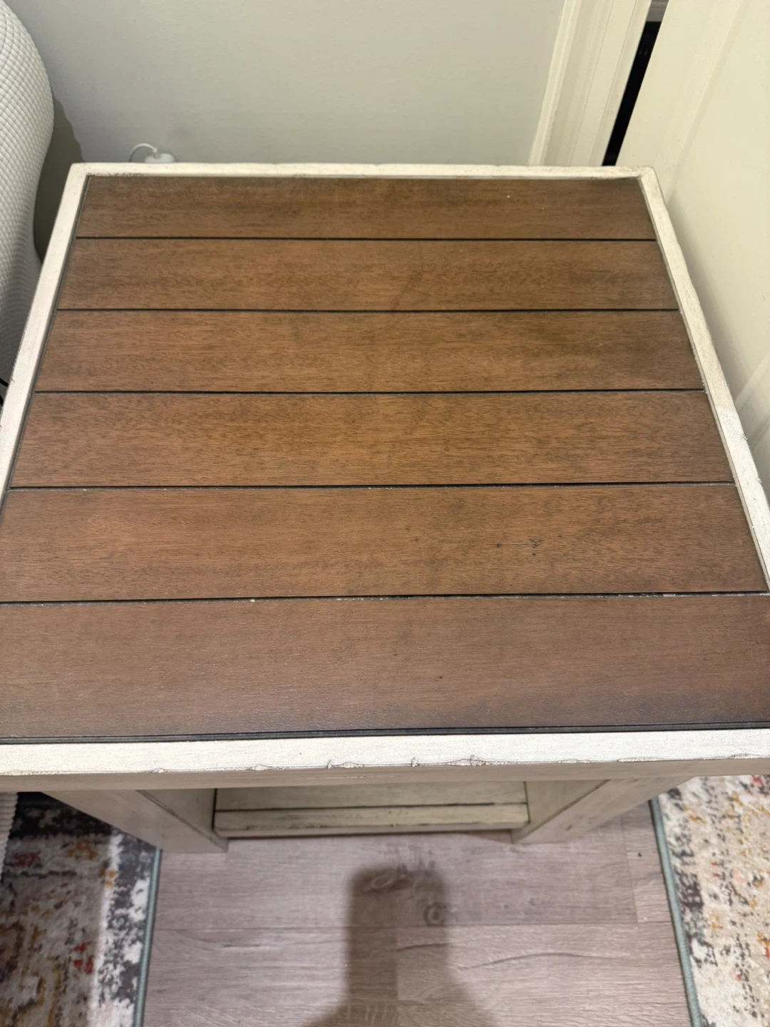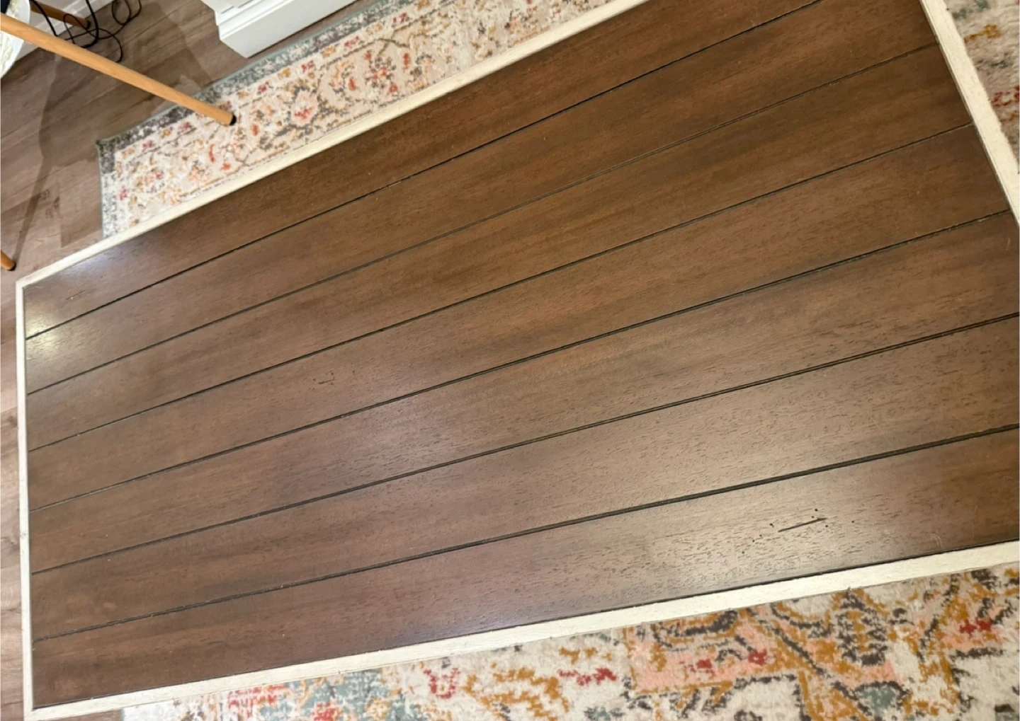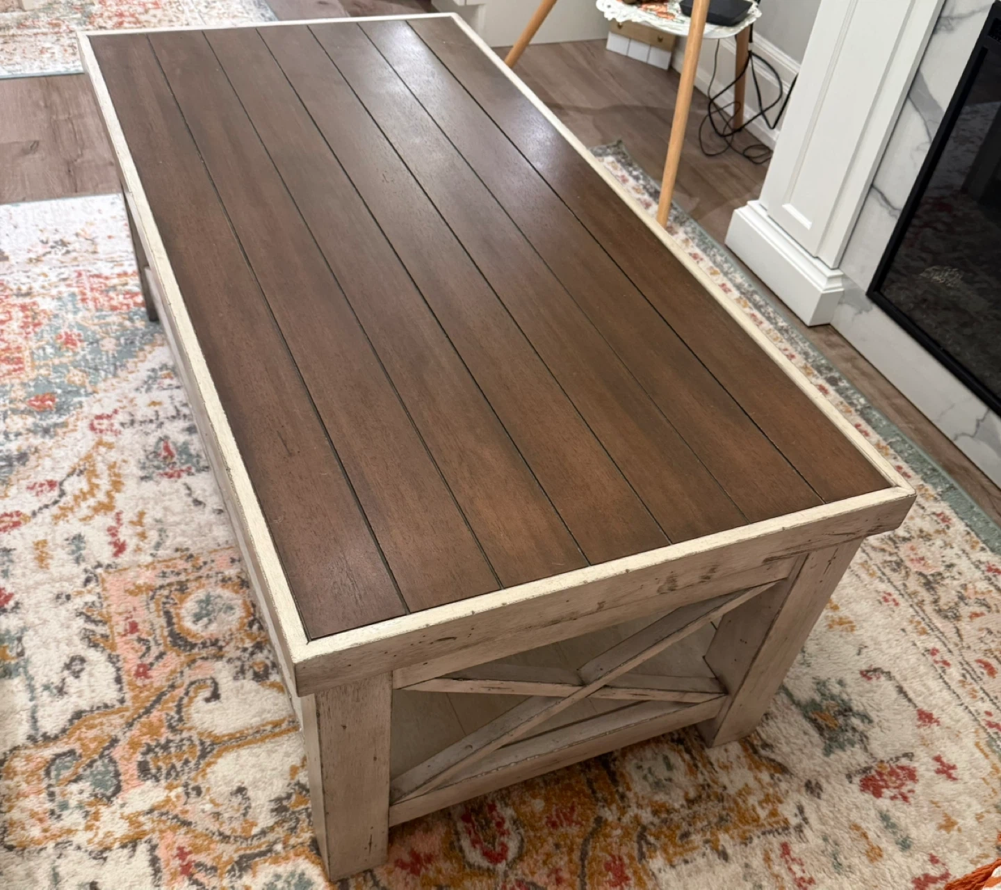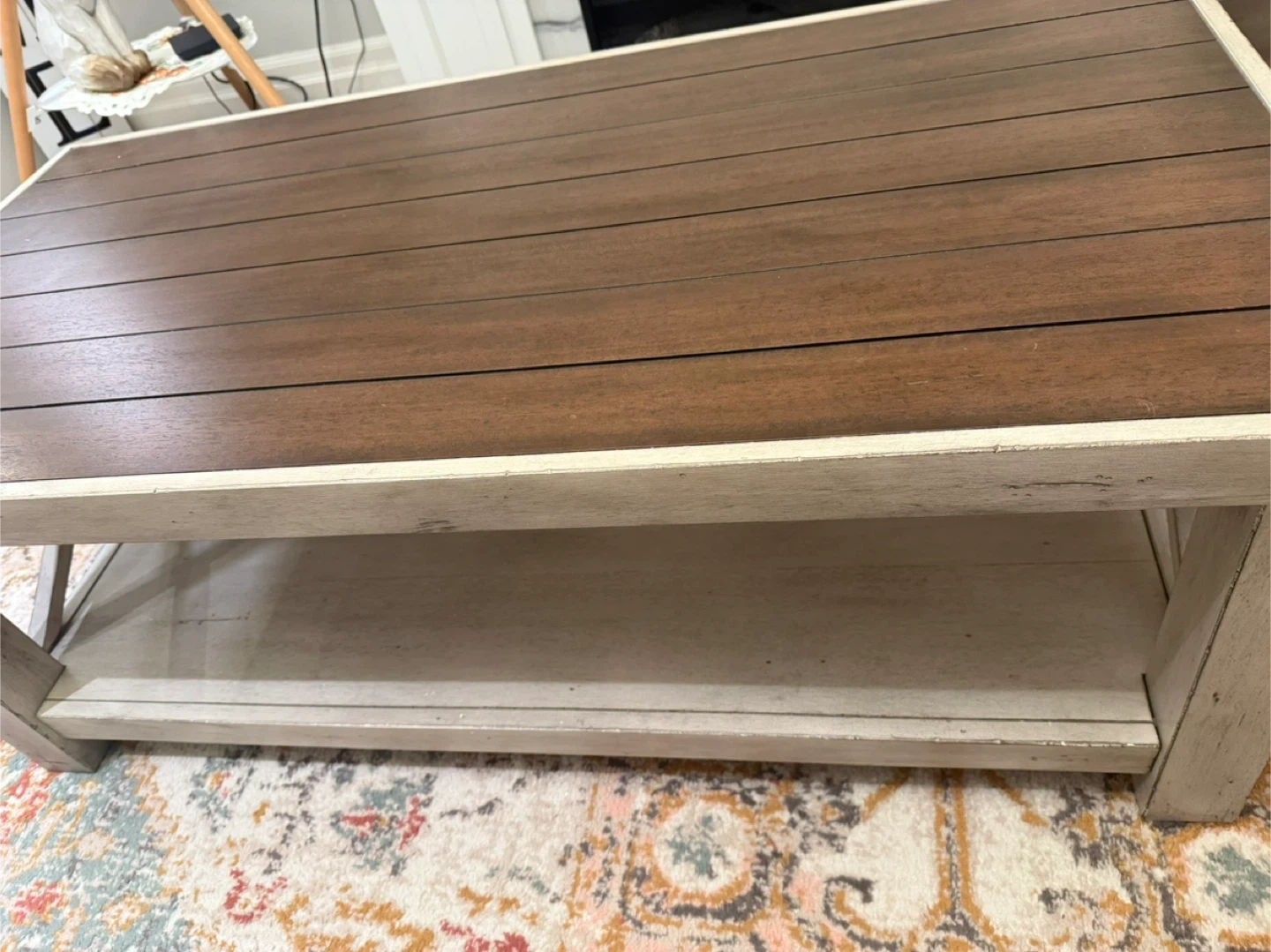 Selling a wood coffee table with a shelf underneath and side table. It's in good condition and would be a great addition to any living room. The table features a rustic design with a brown wood top and a light-coloured base that looks antique style. Really eye catcher. Open to offers. Originally bought from Pier One.