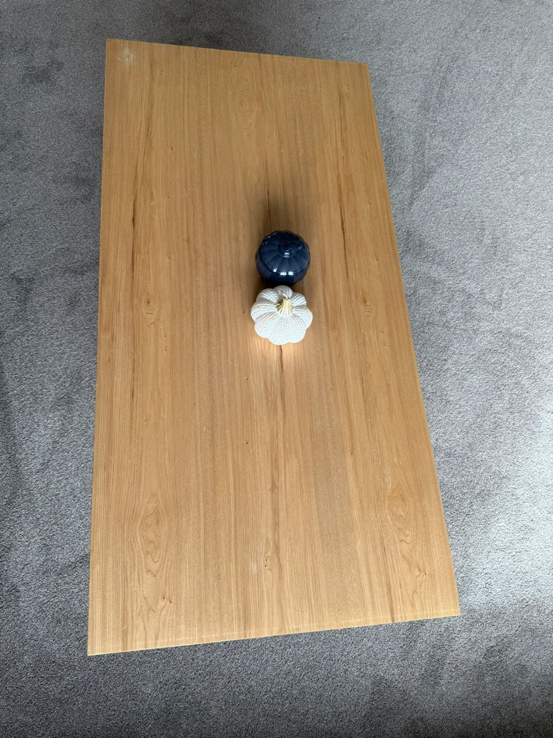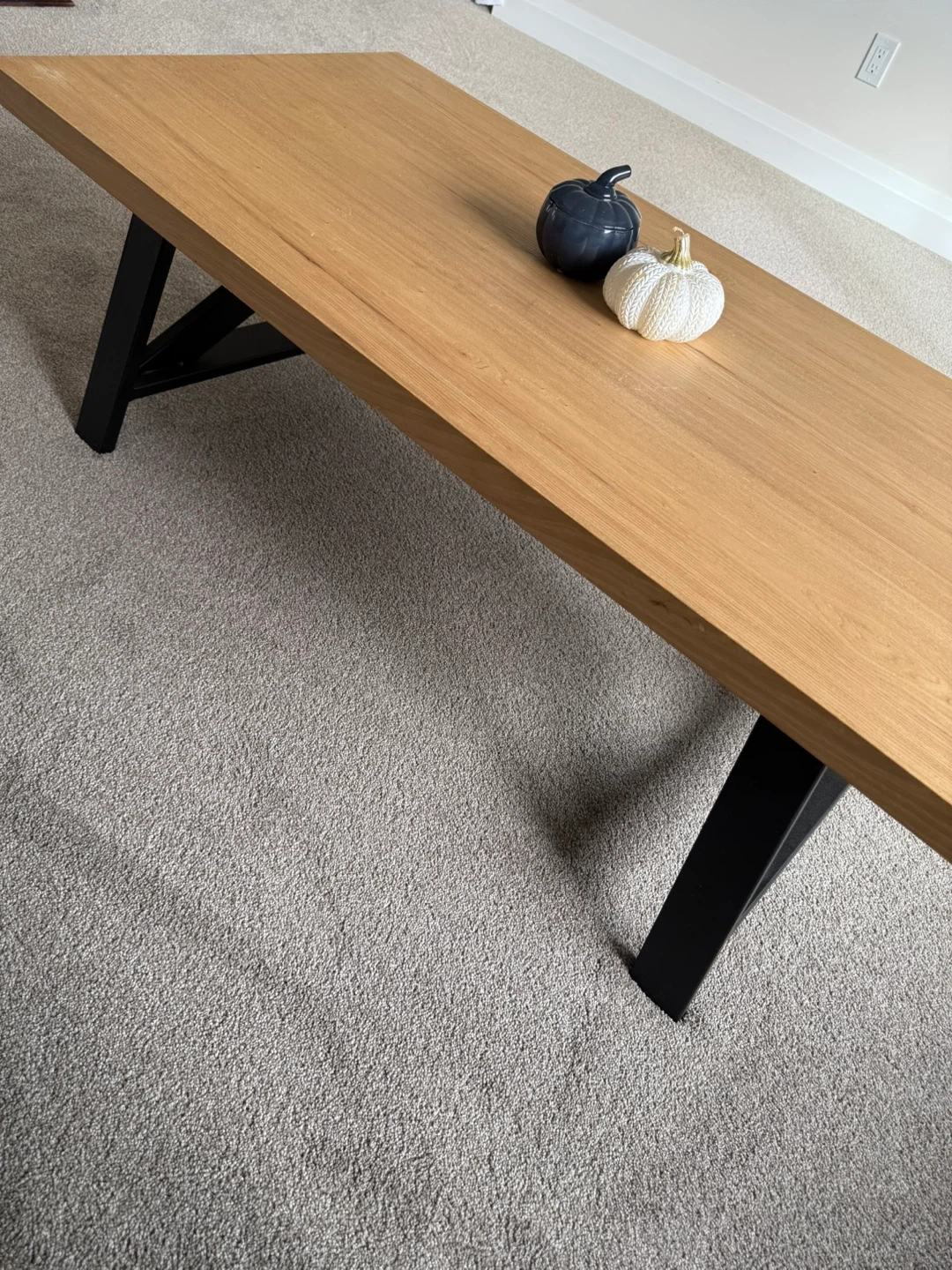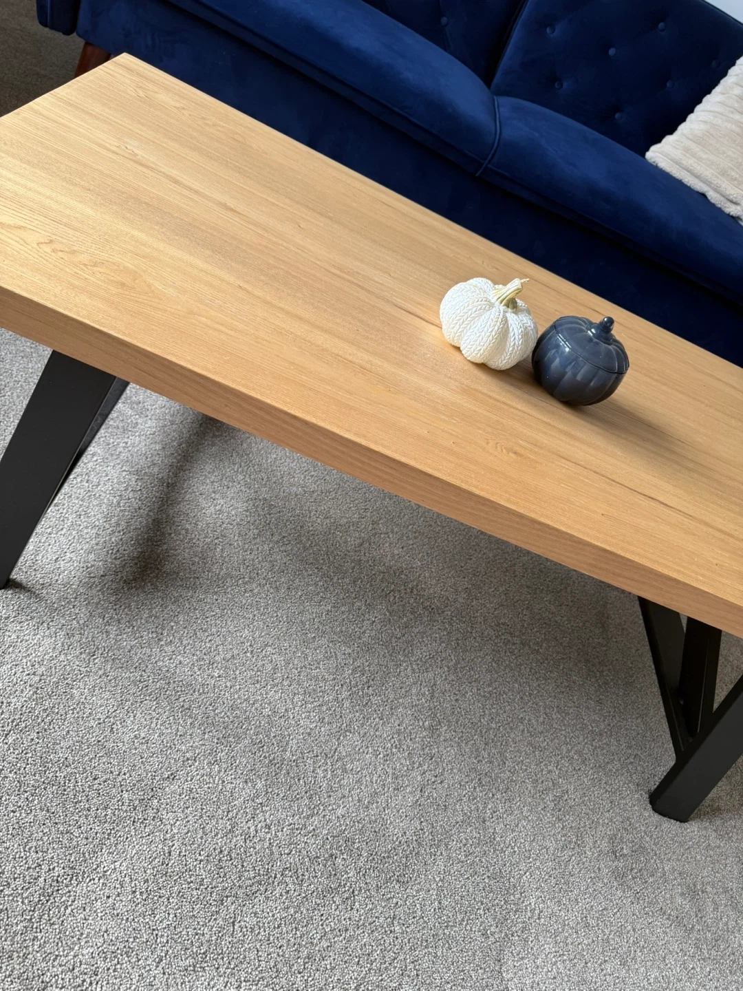 Selling a wood coffee table featuring sleek black legs. It's in great shape and would be a lovely addition to any living room. The table has a beautiful wood grain finish that adds a touch of warmth and style to your space