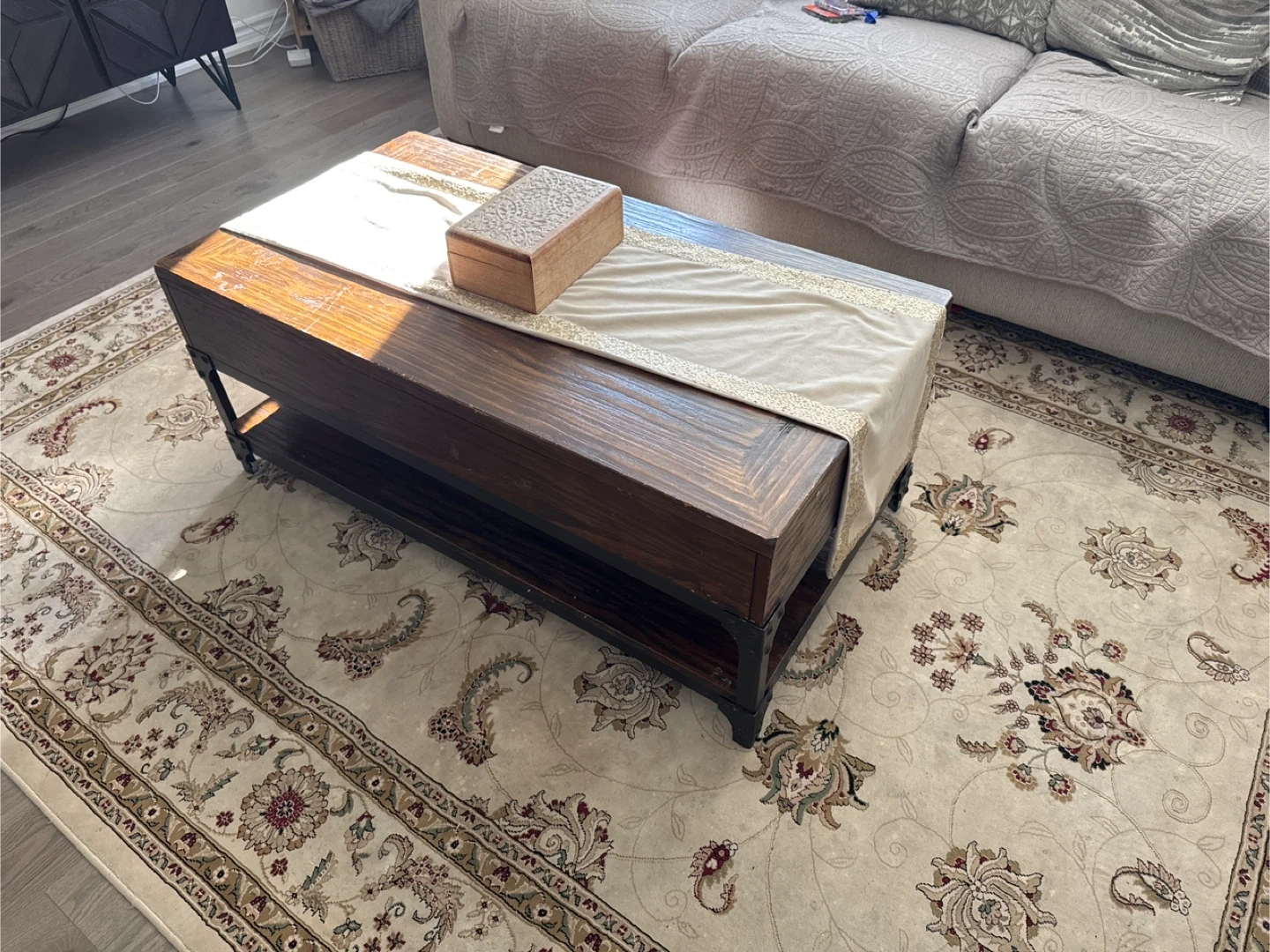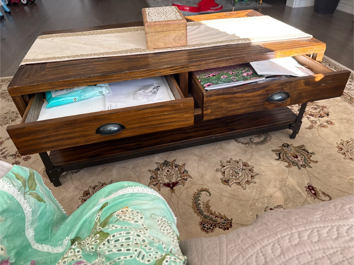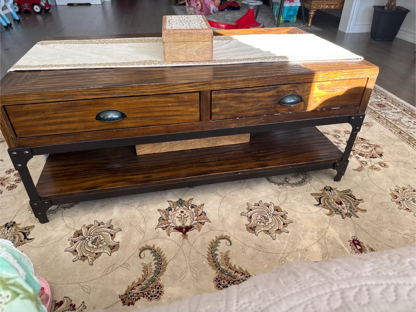 A lovely wood coffee table with handy drawers for storage. It's a great addition to any living room, adding both style and functionality. This table has a rich, warm tone that would fit well with many decor styles. It also has a lower shelf for extra storage or display
