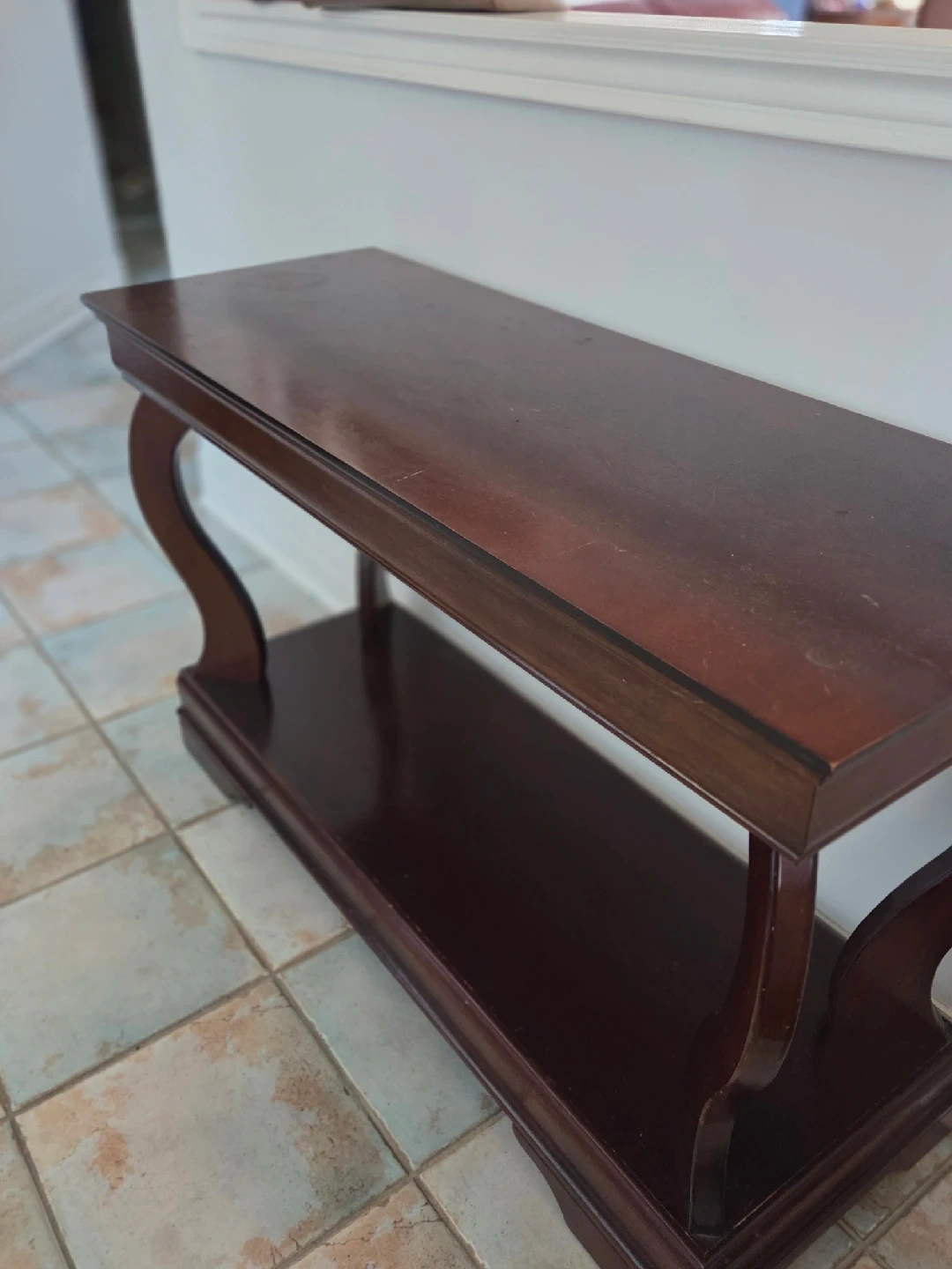 10Selling a lovely wood console table! It's in great condition and ready for a new home. The table measures about 31 inches in length and 18 inches in width, perfect for an entryway or hallway
