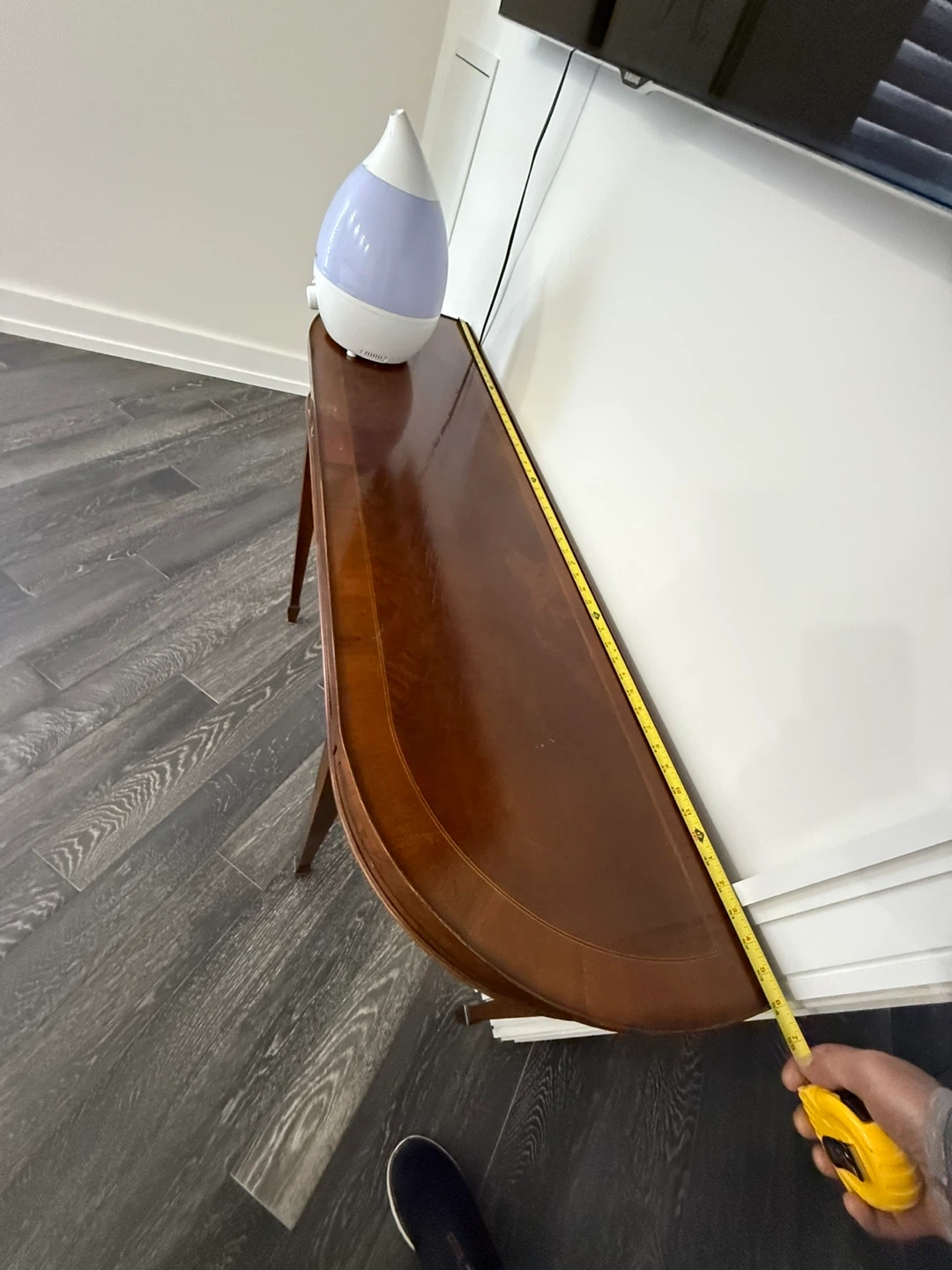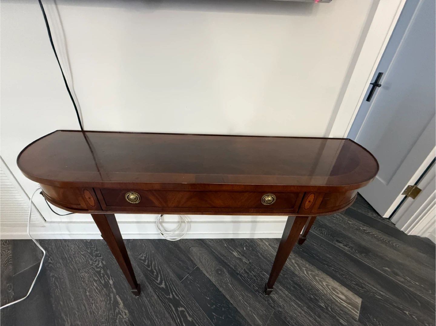 15A lovely wood console table, perfect for an entryway or hallway! It features a rich, dark wood finish and two drawers with brass-tone knobs. Great for adding a touch of elegance to your space!