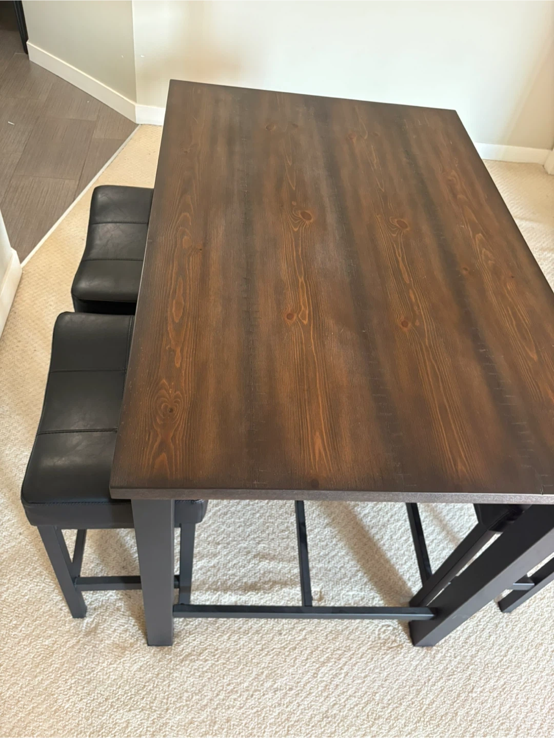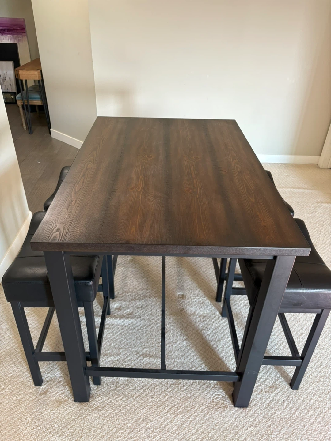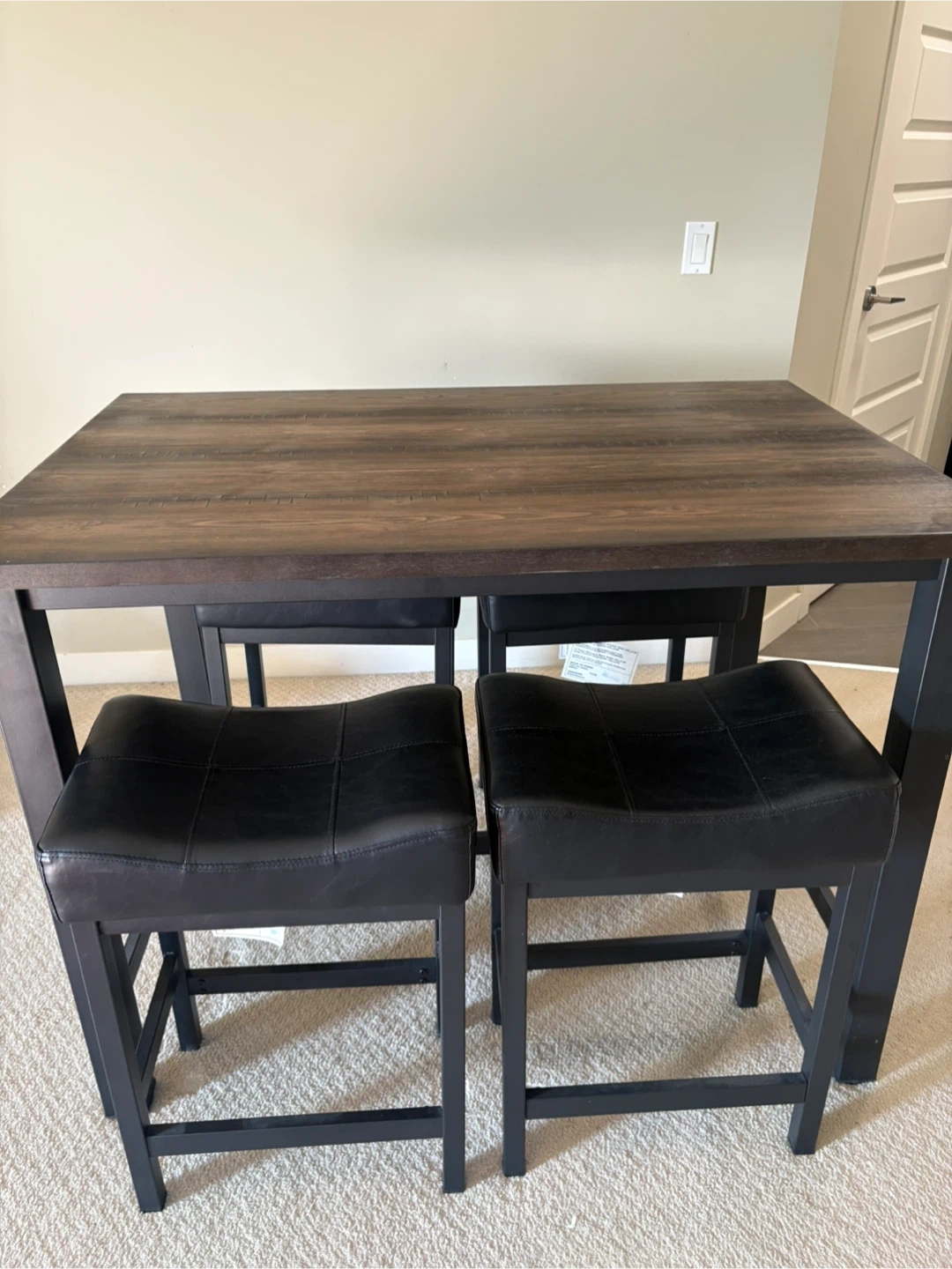 Selling a dining table set that includes the table and four stools. The table has a wood finish, and the stools are upholstered in black. It's a great set for a smaller dining area or kitchen nook!
