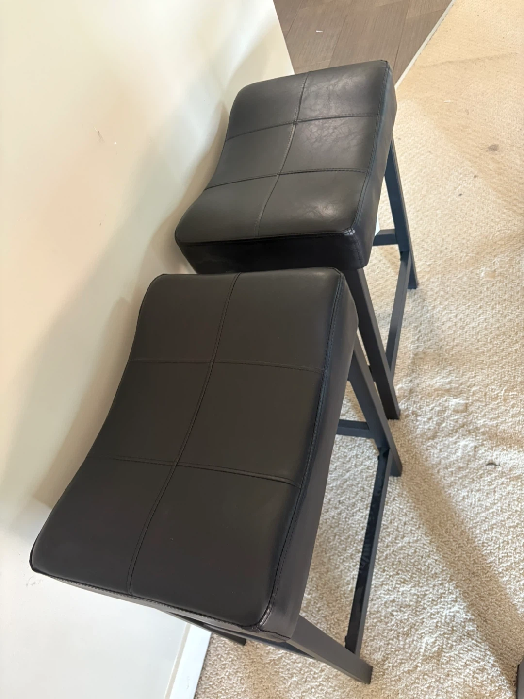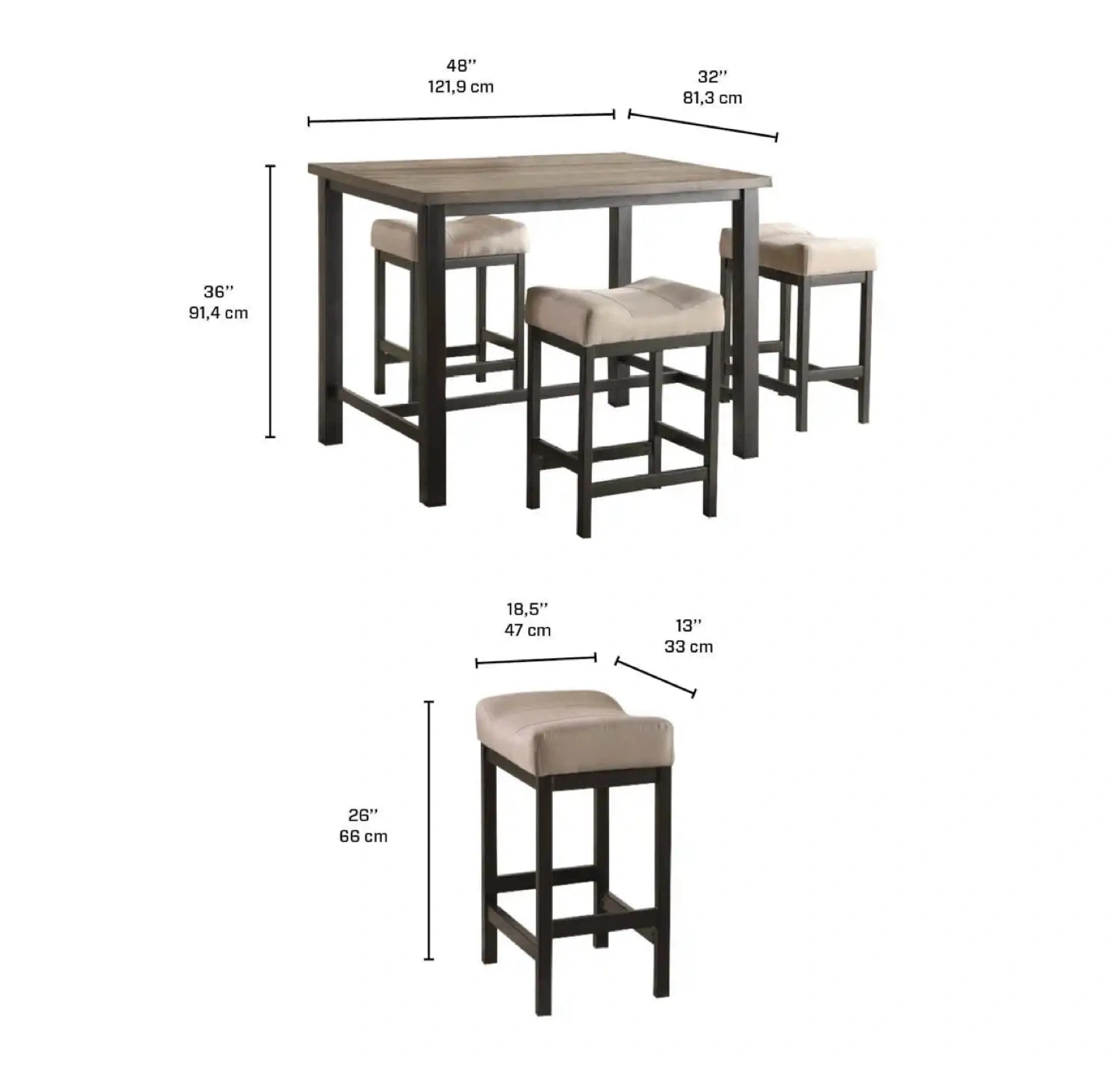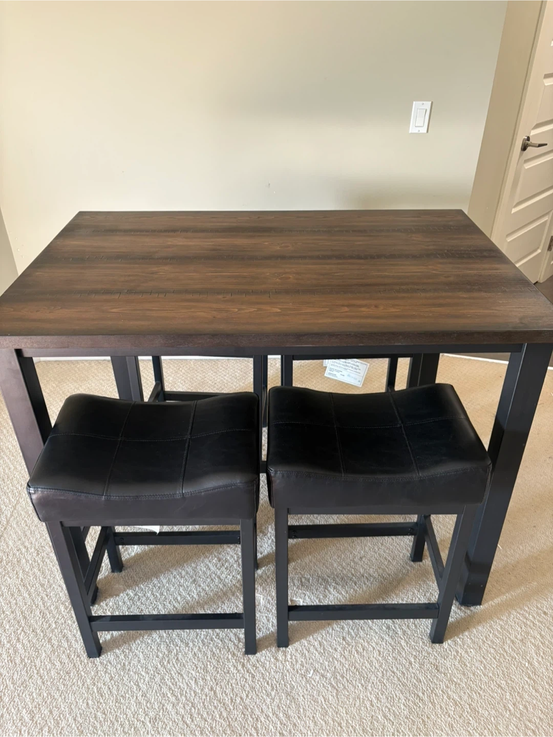 Selling a dining table set that includes the table and four stools. The table has a wood finish, and the stools are upholstered in black. It's a great set for a smaller dining area or kitchen nook!