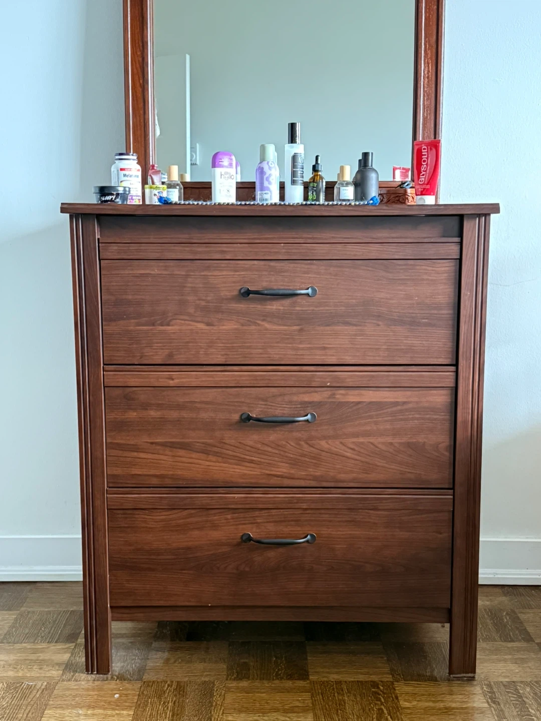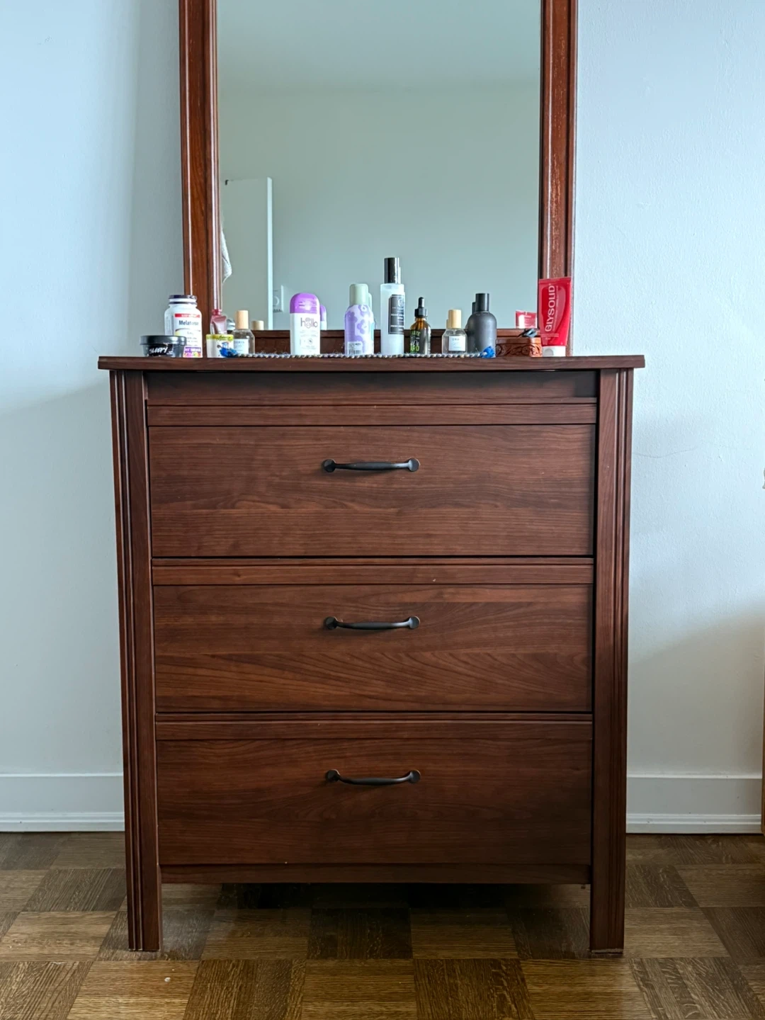 33Mirror is not attached, just mounted on top. Selling a lovely wood dresser. It's in great condition and would look fantastic in any bedroom or living space. The dresser features three spacious drawers, perfect for storing clothes and other essentials