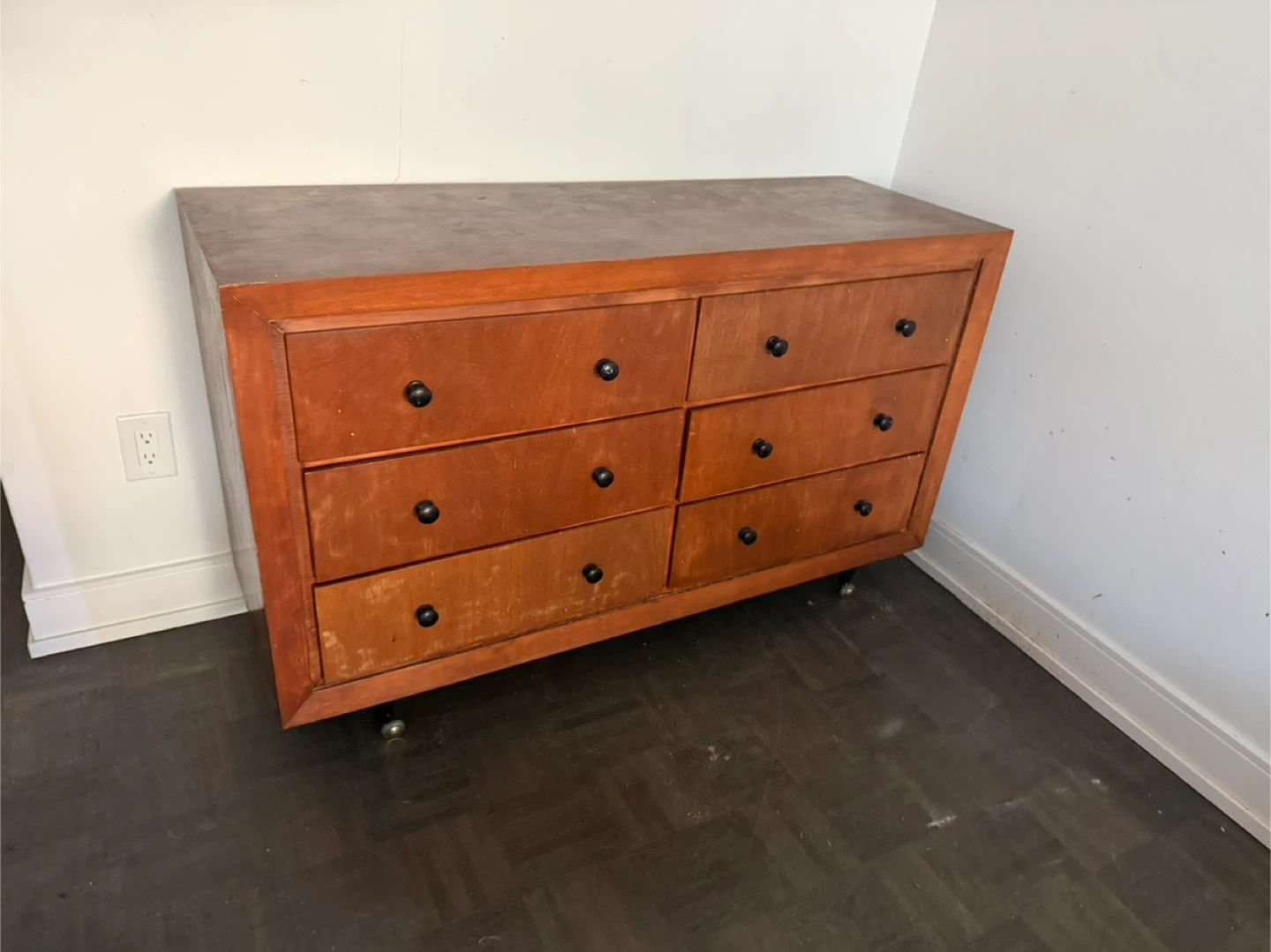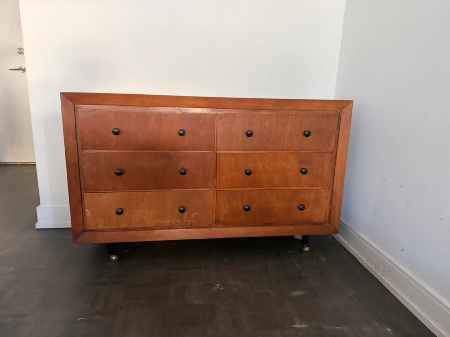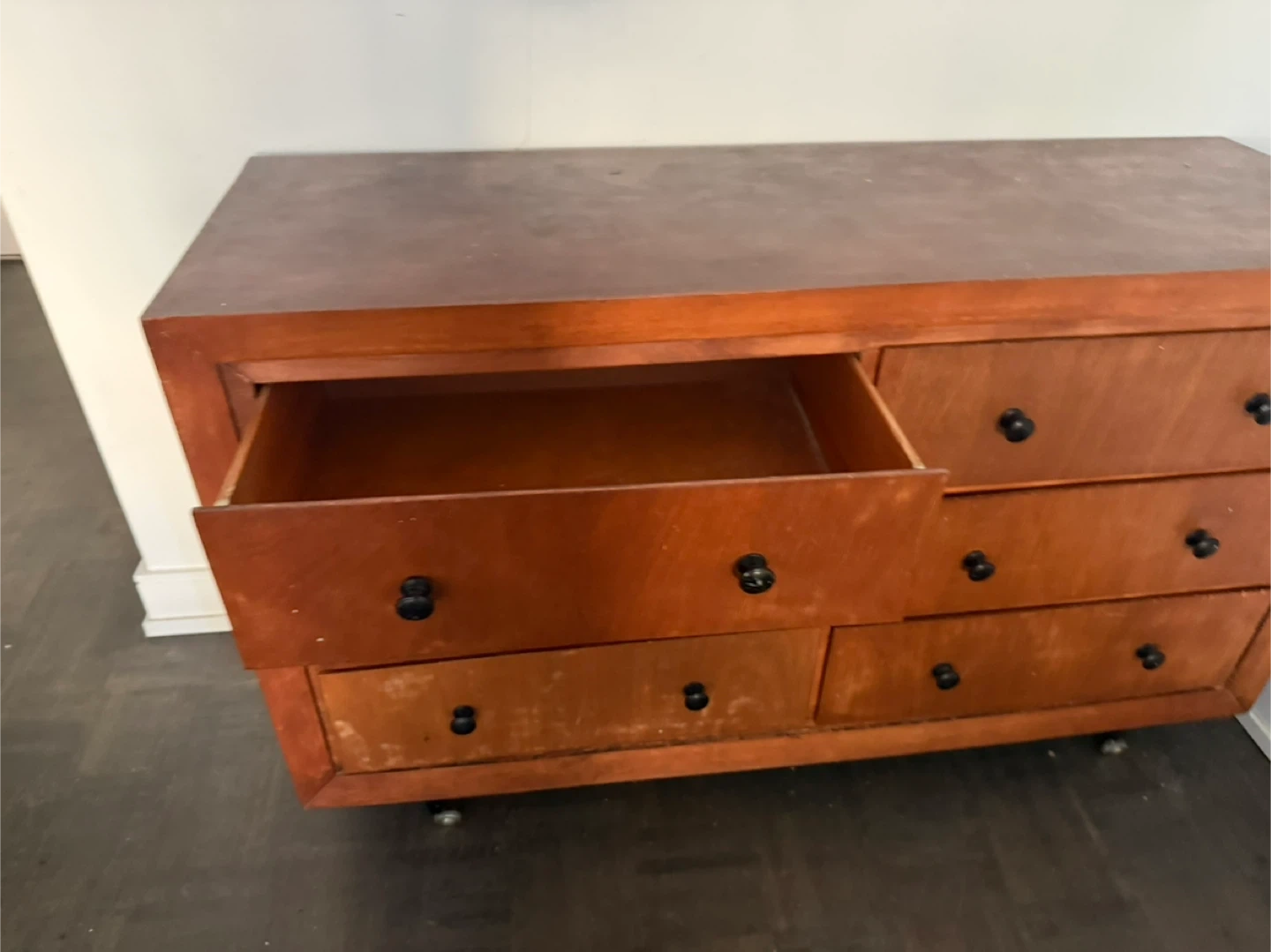 A wood dresser with six drawers. It's a great piece for adding storage to any room. It shows some signs of use but is still functional and sturdy! 52Wx18Dx32H. Pick up only. Around Victoria Park & Ellesmere.