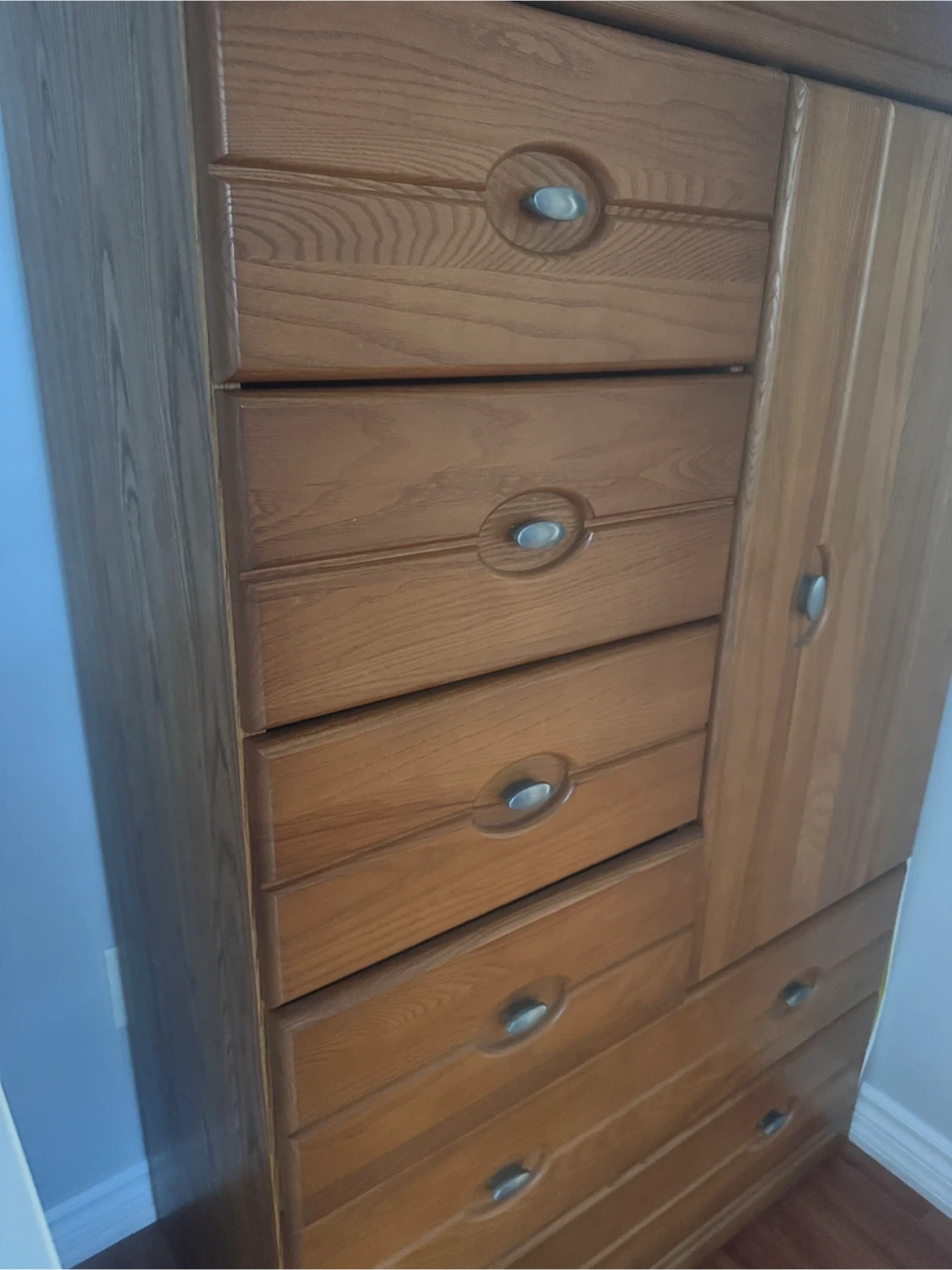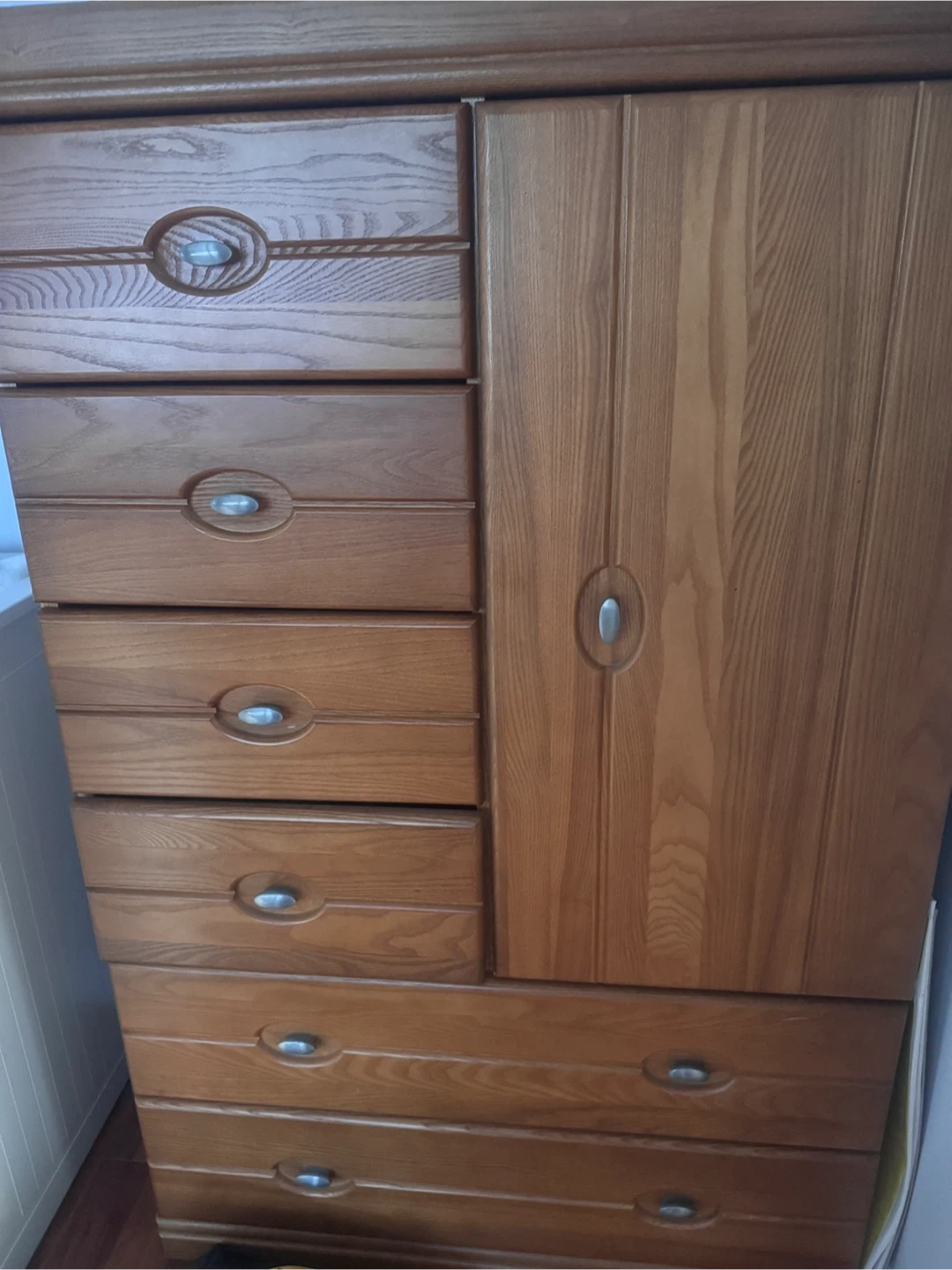 Here's a solid wood dresser! It features multiple drawers and a cabinet with a door for lots of storage. It's in good condition and ready for a new home. Great for organizing your clothes and other items!