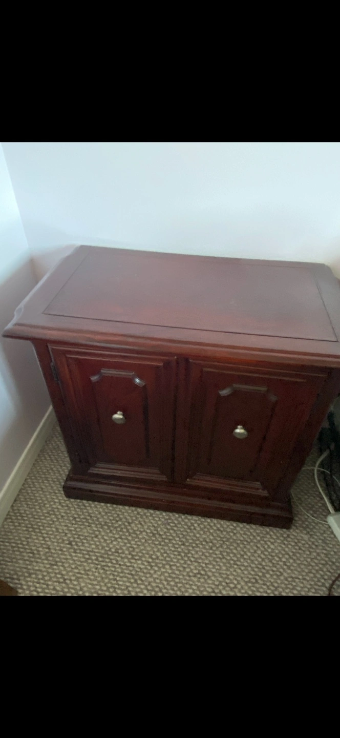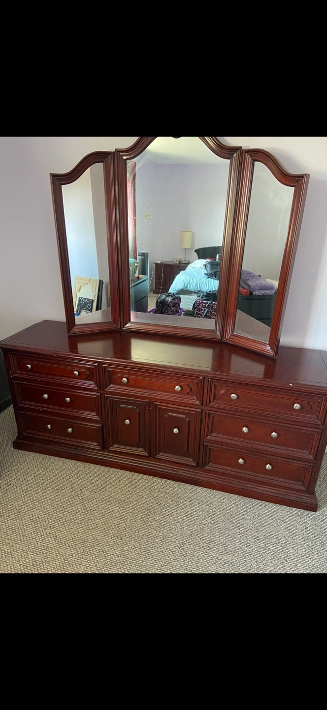 13Selling a wooden dresser with a mirror and side tables. It has a rich, dark wood finish. There are several drawers for storage, and a mirrored top section. It's a great addition to any bedroom! In good condition with some minor scratches and chips.